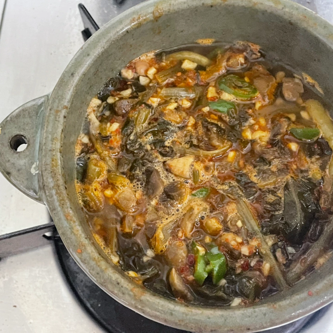 - 버무린 무청에 육수(쌀뜨물+멸치+새우가루(0.5))를 붓고 센불>중 약불로 조리듯 끓인다.