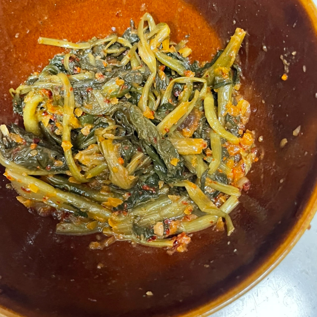 - 무청에 들기름(1), 다진 마늘(1), 된장(1), 고춧가루(1), 미림(0.5), 들깻가루(0.5) 등을 넣어 무친다.