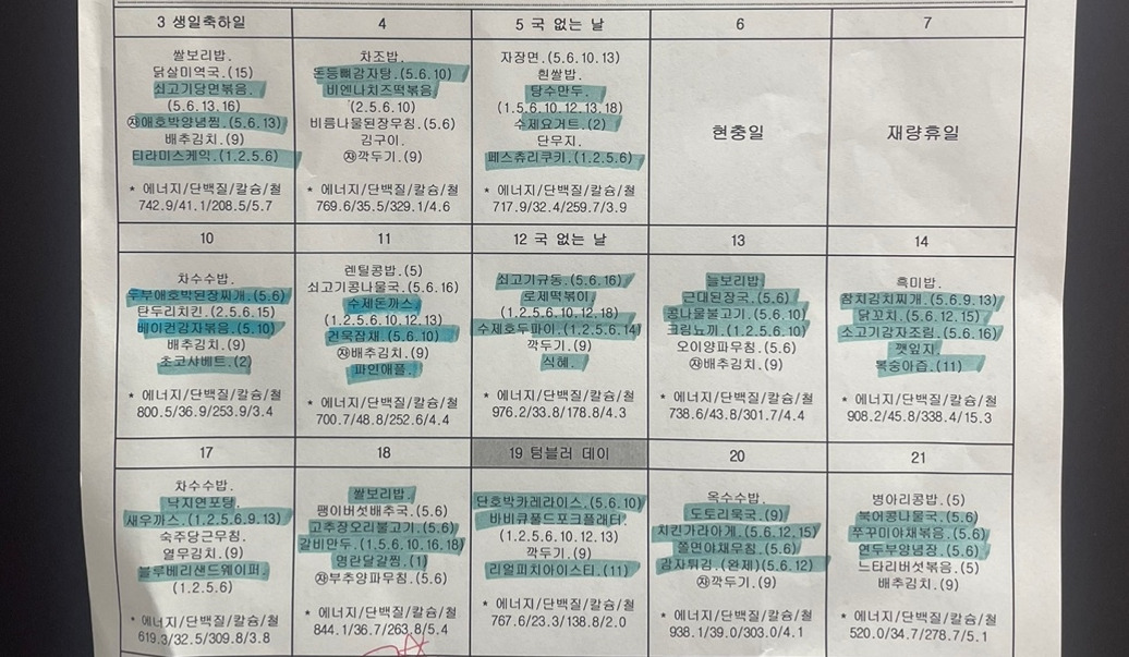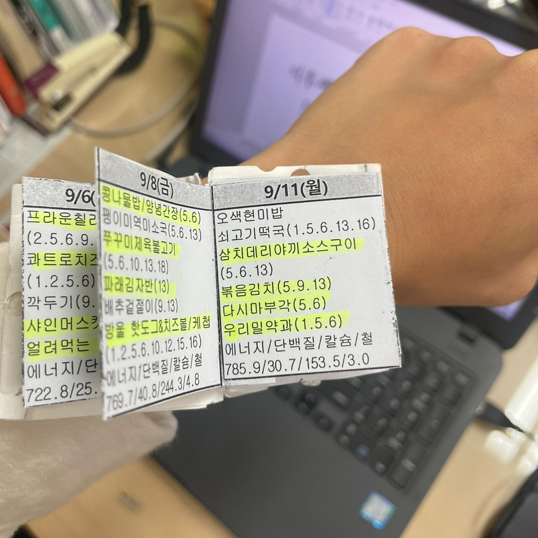 매월 첫째 주가 다가오면 누구보다 빠르게 식단표를 출력해 교무실에 나눠주고, 내 자리 뒤 사물함에는 늘 형광펜으로 색칠한 식단표를 붙여두었다.
