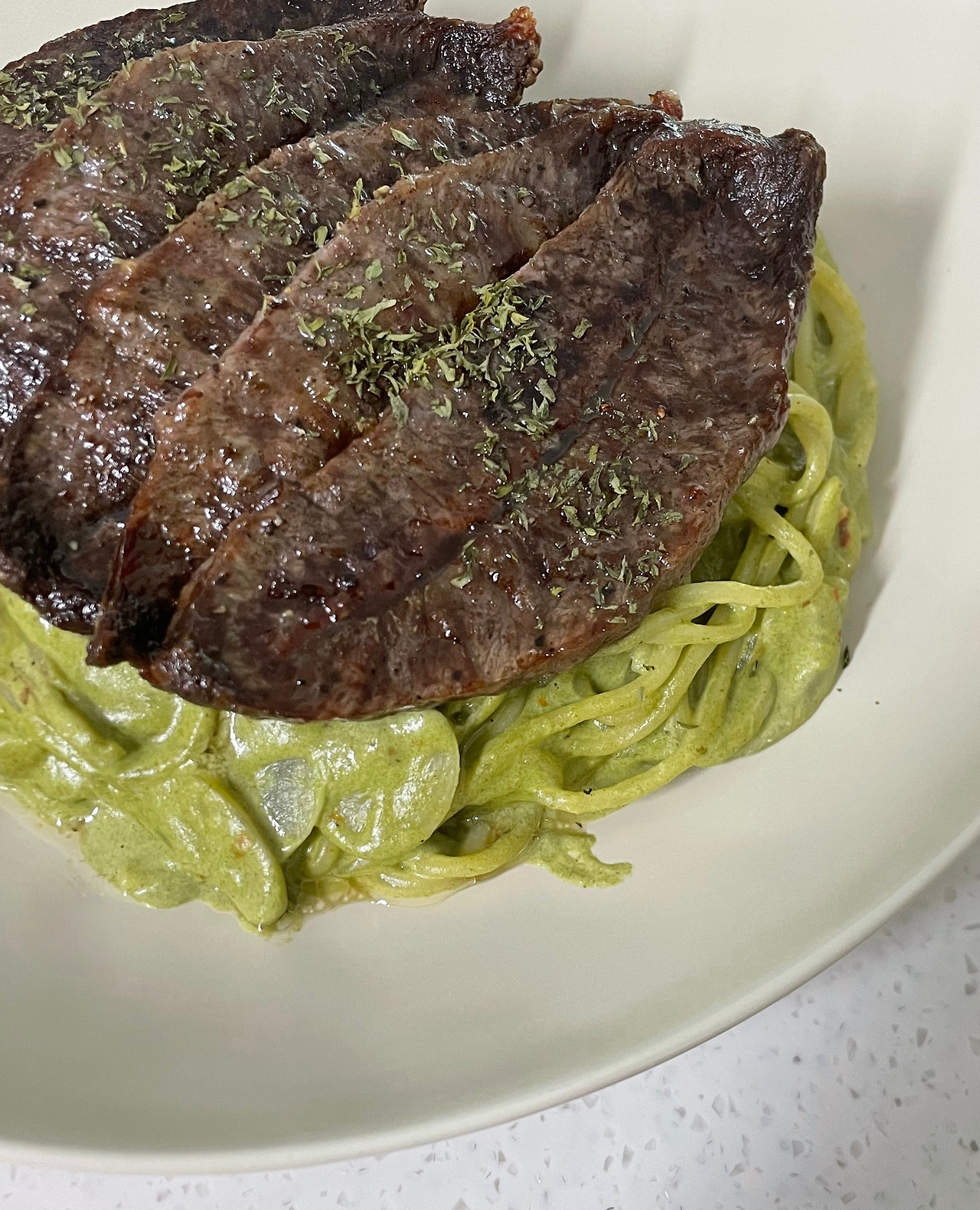 새로 산 세라믹 프라이팬에 페스토와 갓 삶은 면을 살살 버무리자 초록빛이 금세 입혀진다. 여기에 버터에 구운 고기까지 얹으니 여름 한 접시가 눈앞에 펼쳐졌다.