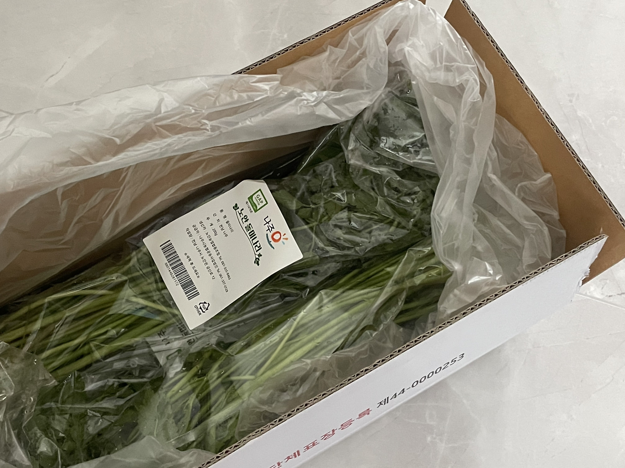 상자 안에는 다섯 단의 미나리가 고개를 내밀고 있었다. 이상한 일이다. 새벽 배송으로 주문했기에 아침에 프레시백을 열면 미나리가 모습을 드러냈어야 했다. 그런데 뜬금없이 오후에 택배 상자라니.