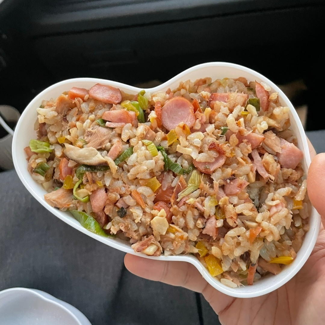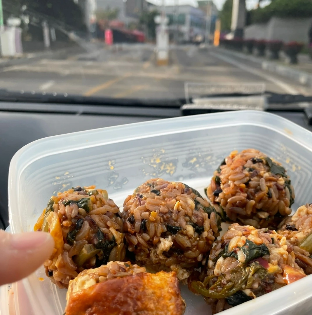 우리는 주차된 차 안에서 볶음밥을 입에 넣거나, 신호에 걸릴 때마다 도시락 뚜껑을 열고 주먹밥을 나눠 먹었다.