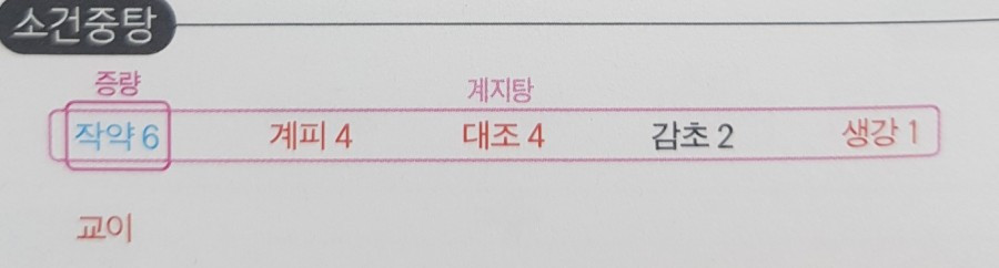 복통과 관련하여 쓰이는 계지가작약탕에서 작약:감초=3:1 비율인 것을 보면 약재들의 배합비가 약효의 방향성을 결정하는 중요한 요인인 듯 하다.