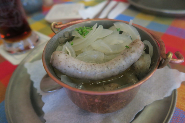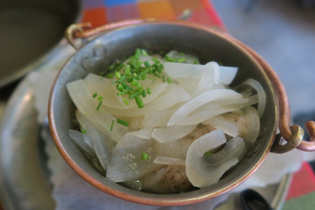 화이트와인에 양파와 함께 끓인 소시지.