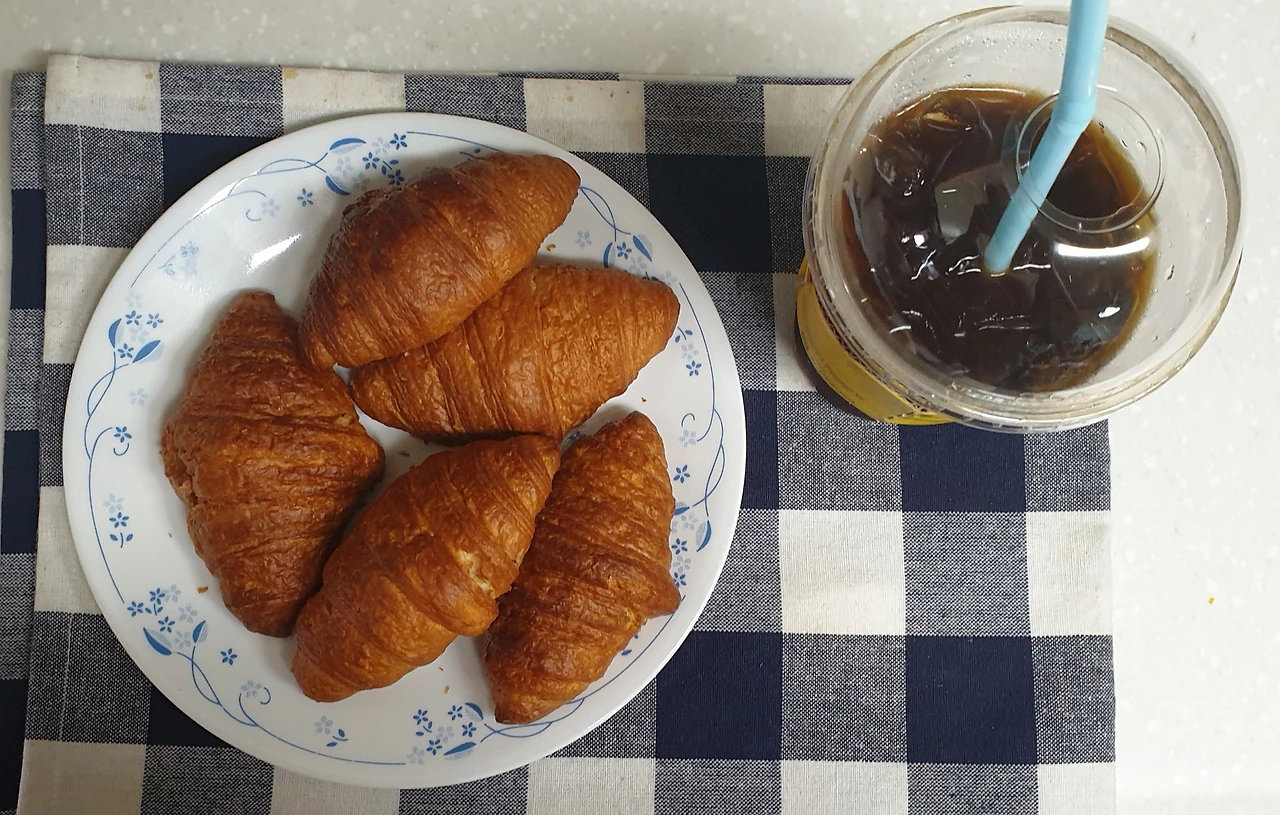 크로와상과 아이스커피... 모두 인스턴트식품이다. 그래도 너희들이 내 육체에 에너지가 되어주니 참 고마운 존재라는 생각이 든다. 크로와상은 에어 프라이그에서 3분 정도 구워내니 너무 먹음직스럽다. 아이스커피는 집 앞 봄봄에서 사들고 온 것, 둘을 함께 먹으니 궁합이 잘 맞는다. 내 입맛에 맞으니 궁합이 좋다고 느끼는 것인지는 모르겠으나 꽤 만족스러운 디저트다. 입은 즐거운데 몸의 생각은 모르겠다. 주인을 잘못 만나 몸에 좋은 음식을 못 먹는다는 사실이 조금은 미안해진다. 사실 나의 뇌는 먹고 싶은 욕구가 많지 않은 편이다. 호르몬의 영향인지는 모르겠으나 내 잘못은 아니라고 말하고 싶다. 너무 많이 먹어서 부대끼는 위도 불편하고, 맛있는 음식이 앞에 있어도 그리 먹고 싶은 식탐이 없는 편이다. 그러다 보니 위가 작은 편임을 느낄 수 있다. 조금만 먹어도 배가 부르기 때문이다. 내가 좋아하는 투썸에서 파니니와 아메리카노를 즐겨 먹는데 파니니 반 조각에 아메리카노 한 잔이면 점심으로 딱 좋은 양이다. 적당한 포만감에 행복감도 함께 온다. 그리곤 식후 글쓰기나 책 읽기를 할 때면 천국이 따로 없다. 내가 좋아하는 장소에서 맛난 디저트로 배를 채우고 뇌 속에 에너지를 채우는 활동이 나에겐 최고의 행복한 순간이 되어준다. 요즘 코로나로 자주 못 가서 이렇게 집에서 대신해본다.