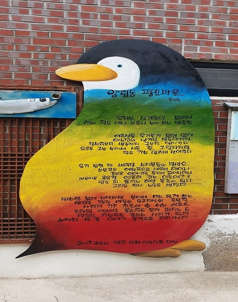 천변 가로수에서 소리치며 울어대는 메 미소리와 천변에 무성한 풀들이 성하기 한 여름을 실감 나게 해 주었다. 평일 낮이라 그런지 광역시 도심 풍경 치고는 제법 한산했다. 15분 정도 걸어서 펭귄마을에 도착했다.