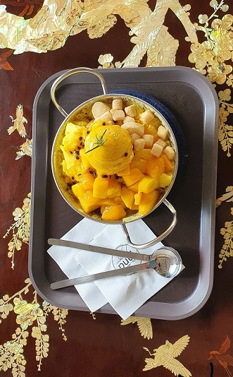 뭘 먹을까? 잠깐 고민하다 망고빙수를 시켰다. 투명한 유리잔에 노란색 망고가 켜켜이 쌓여 있다. 한 입 떠 넣으니 달달하면서 미끄덩 거리는 식감이 입안에서 살살 녹아내린다.