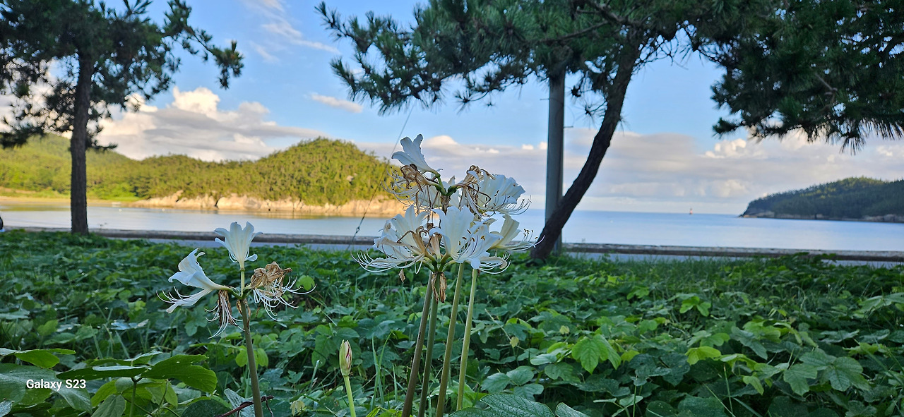 여름꽃 세계유일의 하얀색 상사화가 피어난다기에 기쁨과 설렘을 안고 25일 아침 일찍 위도 해수욕장을 한 바퀴 돌아보았다.