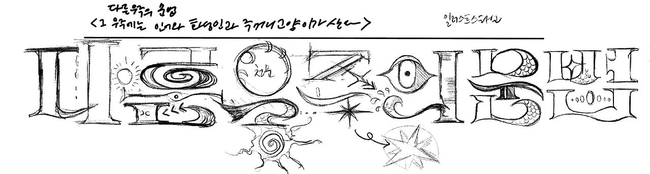 초기 스케치입니다. 제가 책을 읽으며 메모했던 단어들은 '삼각형의 환상, 인어, 비늘, 음파, 수중언어, 돌고래, 몬더그린, 작살과 인어비늘, 자신의 꼬리를 먹는 뱀' 등이 있었습니다. 특히 <다른 우주의 문법> 중 '4장. 바람의 음운론의 이야기'를 최대한 글자에 담으려고 했습니다. 조금 더 얘기를 해보자면, 해당 챕터에서는 제주도 귀덕포구를 배경으로 제주 앞바다에서 자생하고 있는 인어들의 이야기를 다루고 있습니다. 주인공은 '인어의 의사소통'을 주제로 다큐멘터리를 제작하며, 인어들의 언어를 실제로 습득해 그들과 대화를 나누기도 합니다. 하지만 인어를 동등한 위치로 표현하기보다는 '가축'이라 표현하며, 그들의 언어를 익히고 소통하는 행위를 '연구'로 규정합니다.