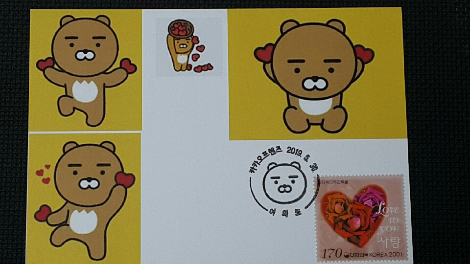 지난 2019년 7월에 카카오프렌즈 우표가 나왔었다. 물론 그전에 뽀로로, 라바 등등 캐릭터우표들이 나온 적도 있긴 했는데, 카카오프렌즈의 그 위상을 고려하면 기대 많이 됬었고 ㅎ