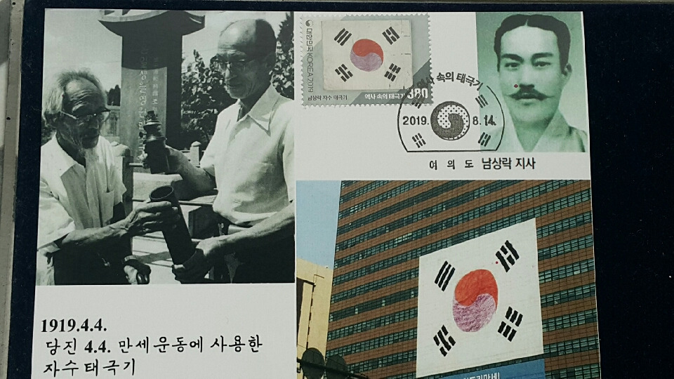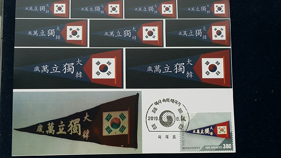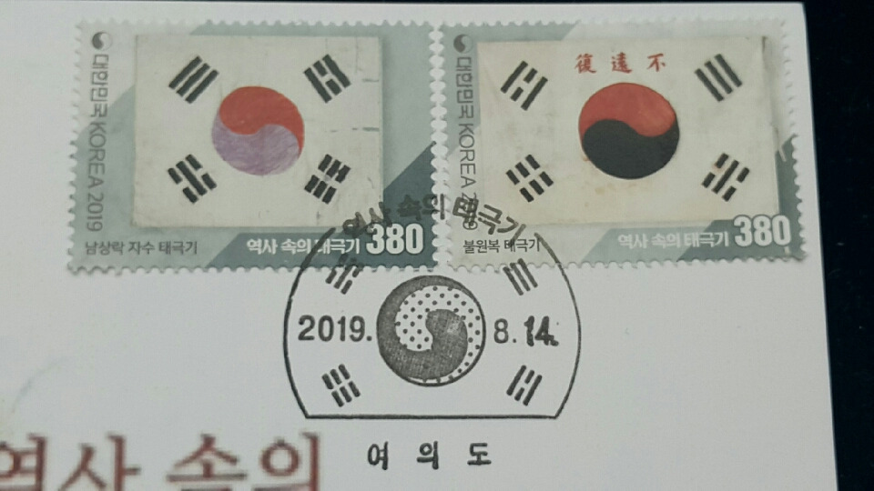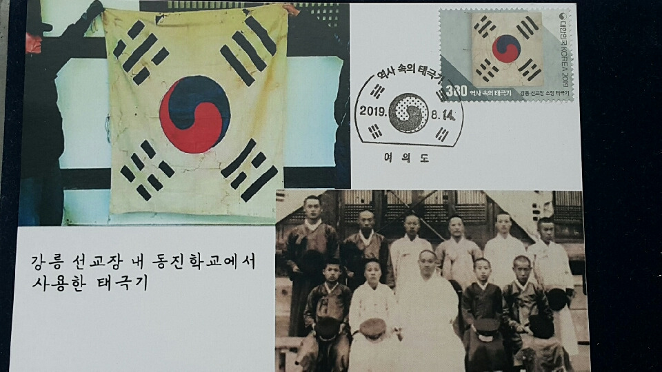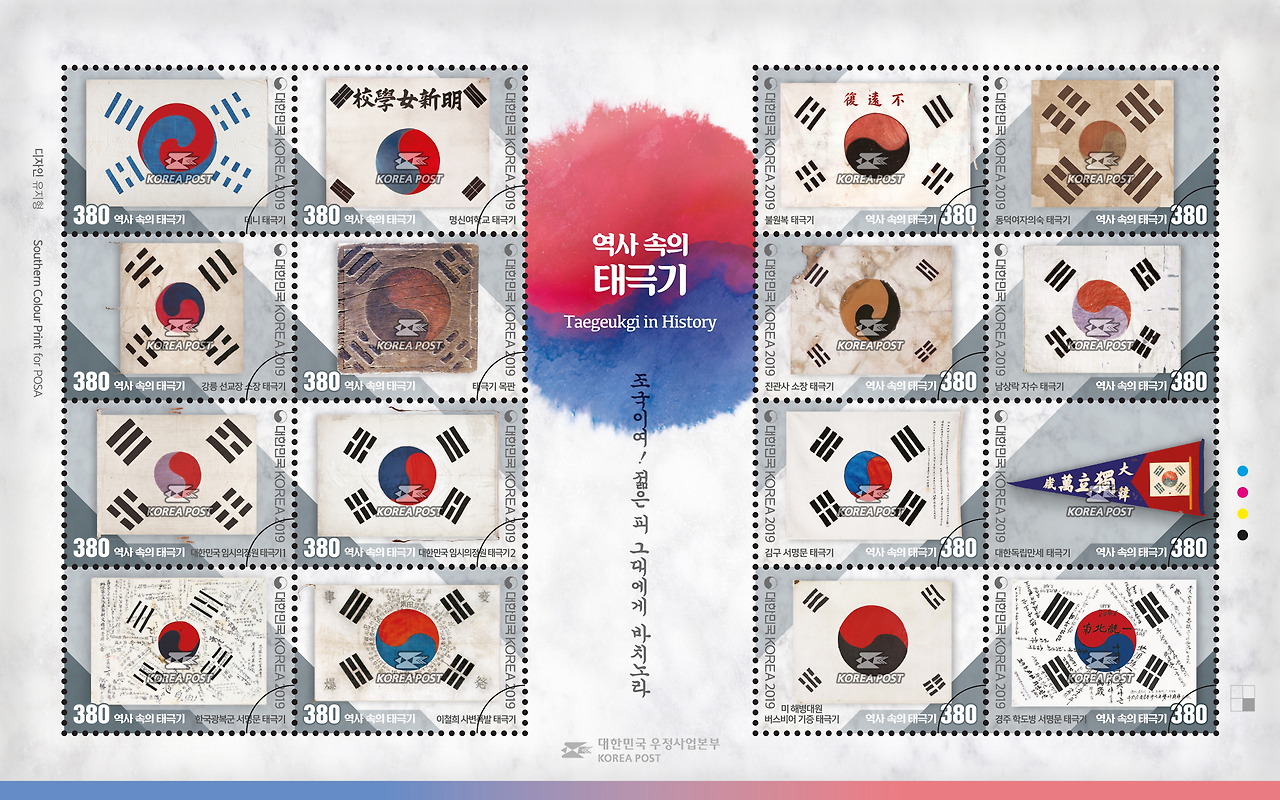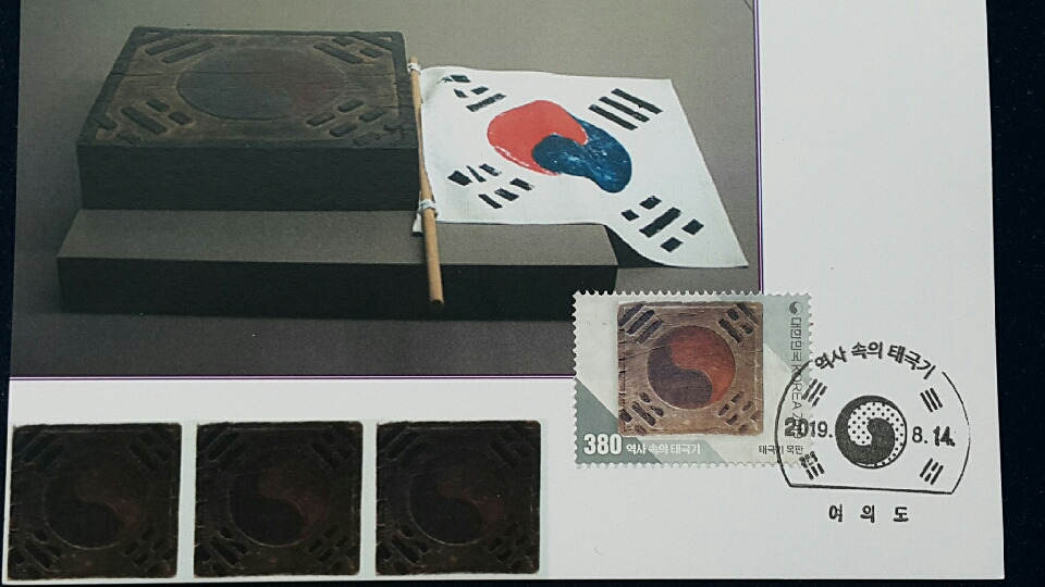 이와 같이 현재모양대로 정착되기 전에 초기에는 태극기의 괘모양, 괘 배열, 태극 모양 등에 따라 여러 버젼이 있었다는 내용이고, 3.1만세운동 100주년을 맞았던 지난 2019년에 16종의 태극기 우표가 발행된 바 있었다. 이른바 '역사 속의 태극기' 시리즈 이름하에..