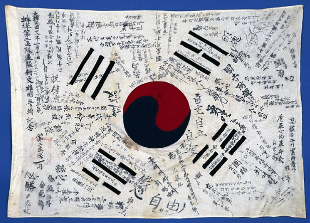 대한민국 임시정부 김구 주석이 1941년에 중국에서 미국으로 가는 벨기에 출신의 매우사(梅雨絲, 미우스 오그) 신부에게 준 태극기.. 1941년이니 충칭시대..