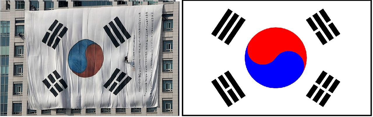 아래 비교사진 보시면 태극문양도 그렇고 무엇보다 4괘 ( _ , = , == ) 가 좌우가 바뀐 것으로 보인다는 내용이었다.