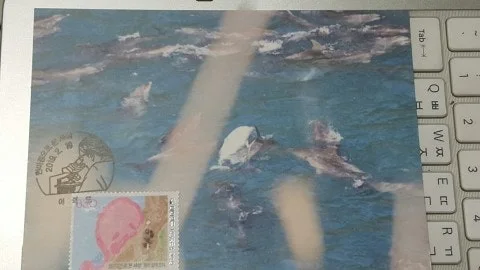 오호라! 어제 밤 꿈이 좋더니 바다의 로또 아니냐. 알비노 색소변종의 이 흰 돌고래는 큰 돈벌이가 되기에 생포대상으로 점찍혀서 나홀로 살아남고 위 사진의 나머지 평범한(?) 수백마리의 돌고래들은 이날 살육되었다