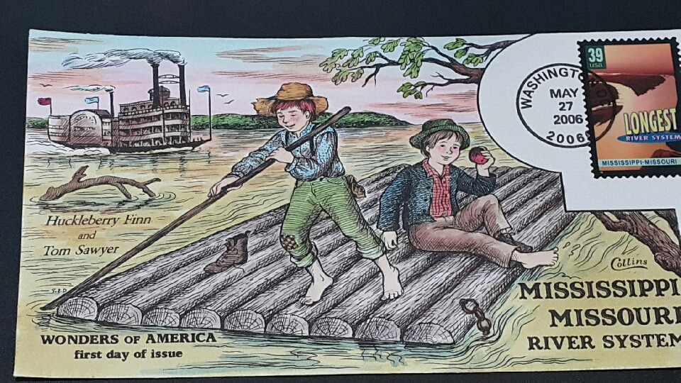 톰소여와 허클베리핀 두 아이가 같이 미시시피강 위에서 뗏목을 젓는 모습.