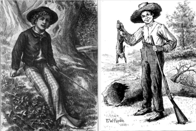 『허클베리 핀의 모험』 (1884년 출간) : 허클이 주인공, 톰 소여는 후반부에 등장
