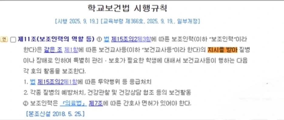 지금의 현장은 이 조항을 “보건실을 대신 지키는 인력 운영”의 근거로 삼고 있다.