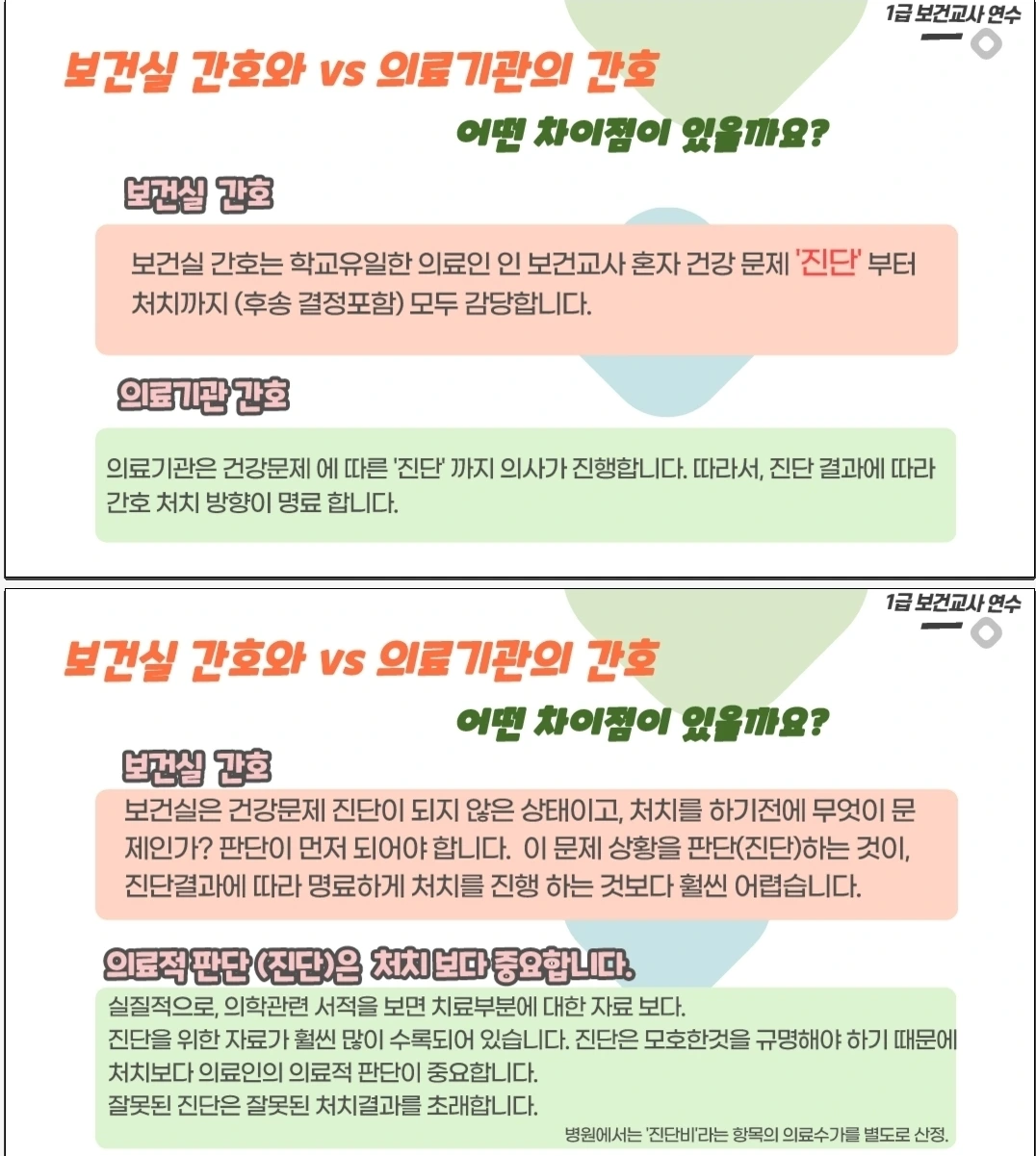 병원의 간호가 ‘진단 이후의 간호처치’라면, 보건실 간호는 ‘진단 이전, 의료적 판단에 따른 책임’이라 할 수 있습니다. 이 책임은 무겁고, 때로는 고독합니다. 누구의 지시도 받지 않은 채 스스로 판단해야 하기 때문입니다. 그러나 바로 그 점이 학교에서 보건교사라는 존재의 가치를 가장 잘 증명할 수 있는 역할 이라고 생각합니다.