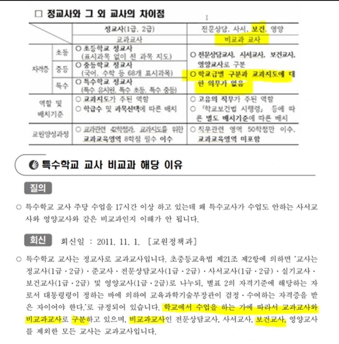 비교과교사: 수업이 아닌 '교과 외 교육활동'을 전담하는 교사. 상담, 보건, 영양, 사서 등이 여기에 속한다.