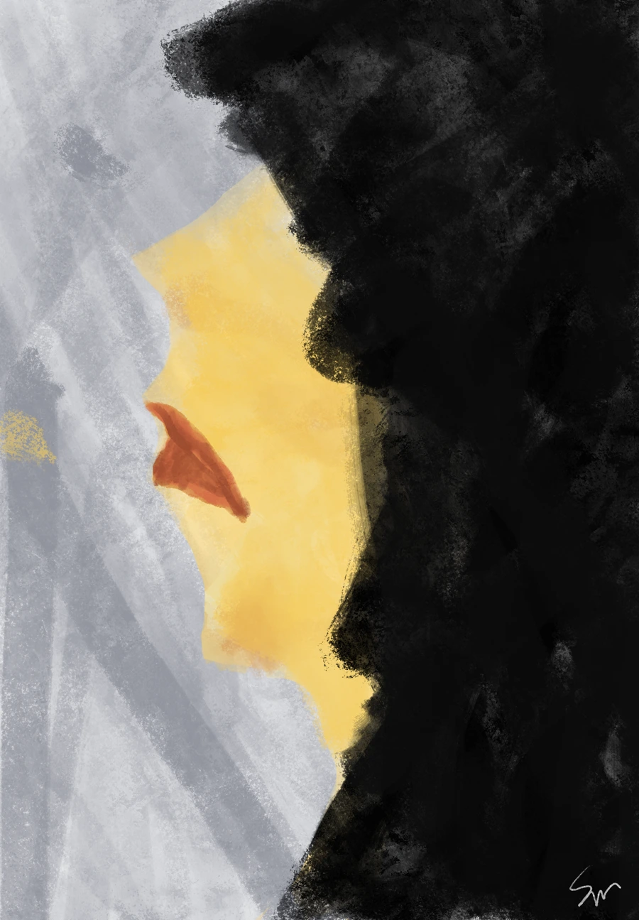 그녀는 지금 눈물을 참고 있는 중입니다.