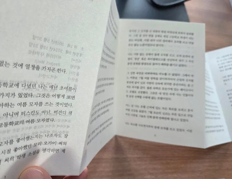 10페이지 짜리 짧은 소설을 인쇄한 뒤 접어서 얇은 종이봉투 안에 넣어 뒀더군요.