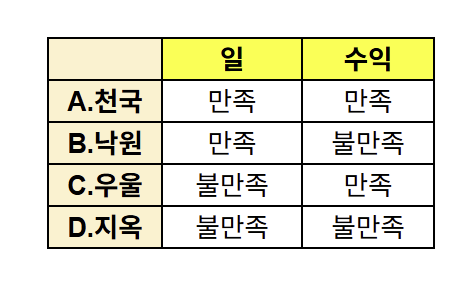 D. 지옥(일도 싫고 수익도 만족스럽지 않은 경우)