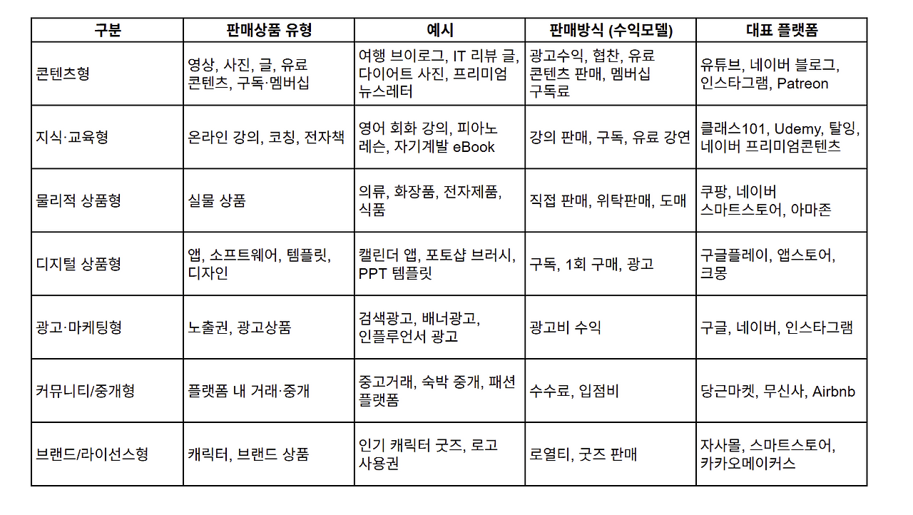 무형 상품: 만질 수는 없지만 가치 있는 것. 예를 들어, 가계부 앱을 만들어 구독료를 받거나, 엑셀 가계부를 제작해 판매하는 것