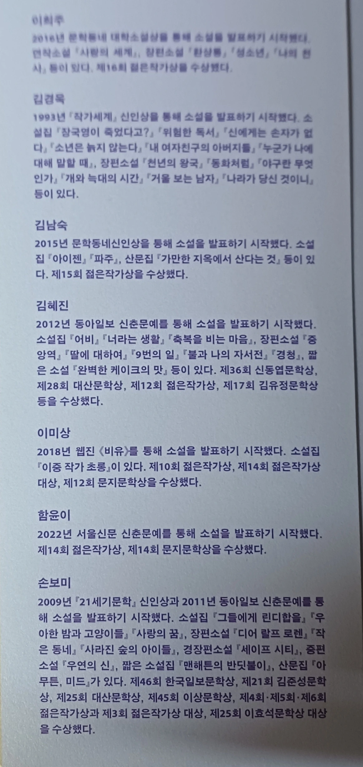 김경욱 작가와 김남숙 작가, 김혜진 작가 그리고 이미상 작가도 궁금했는데 글로 만나서 좋았다. 그리고 함윤이 작가와 손보미 작가의 글이 각기 다른 매력과 느낌을 남겨준 독서였다.