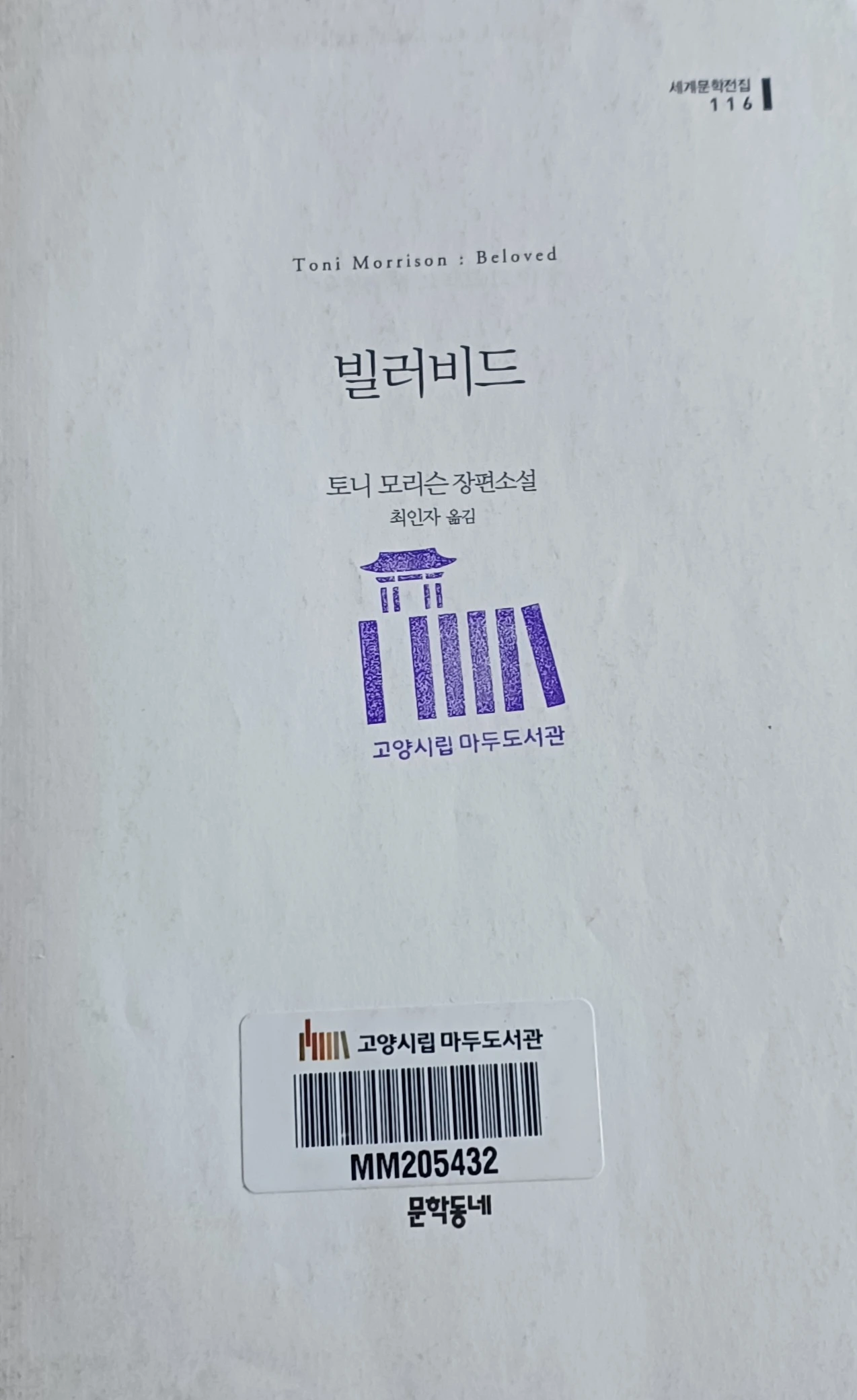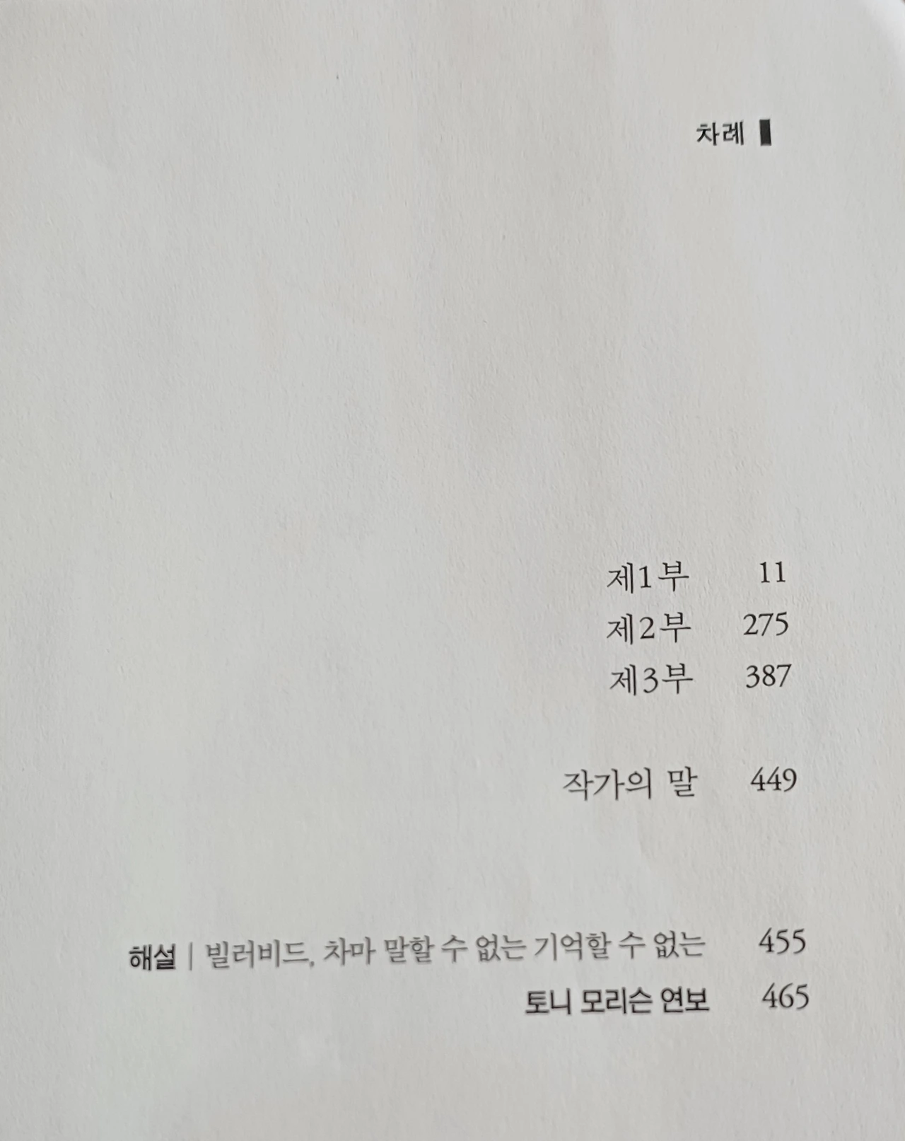 "빌러비드." 여자가 대답했다. 목소리가 너무 낮고 거칠어 세 사람은 서로 번갈아 마주 보았다. 목소리부터 귀에 들어왔고, 그다음에야 이름이 들렸다. p92