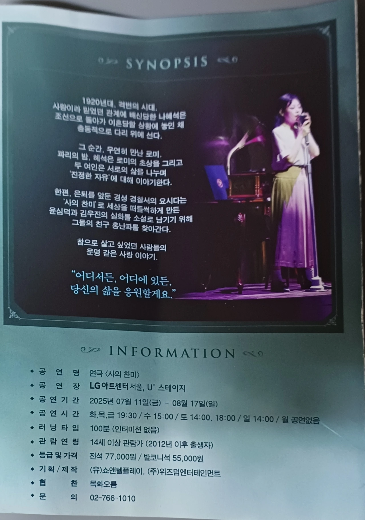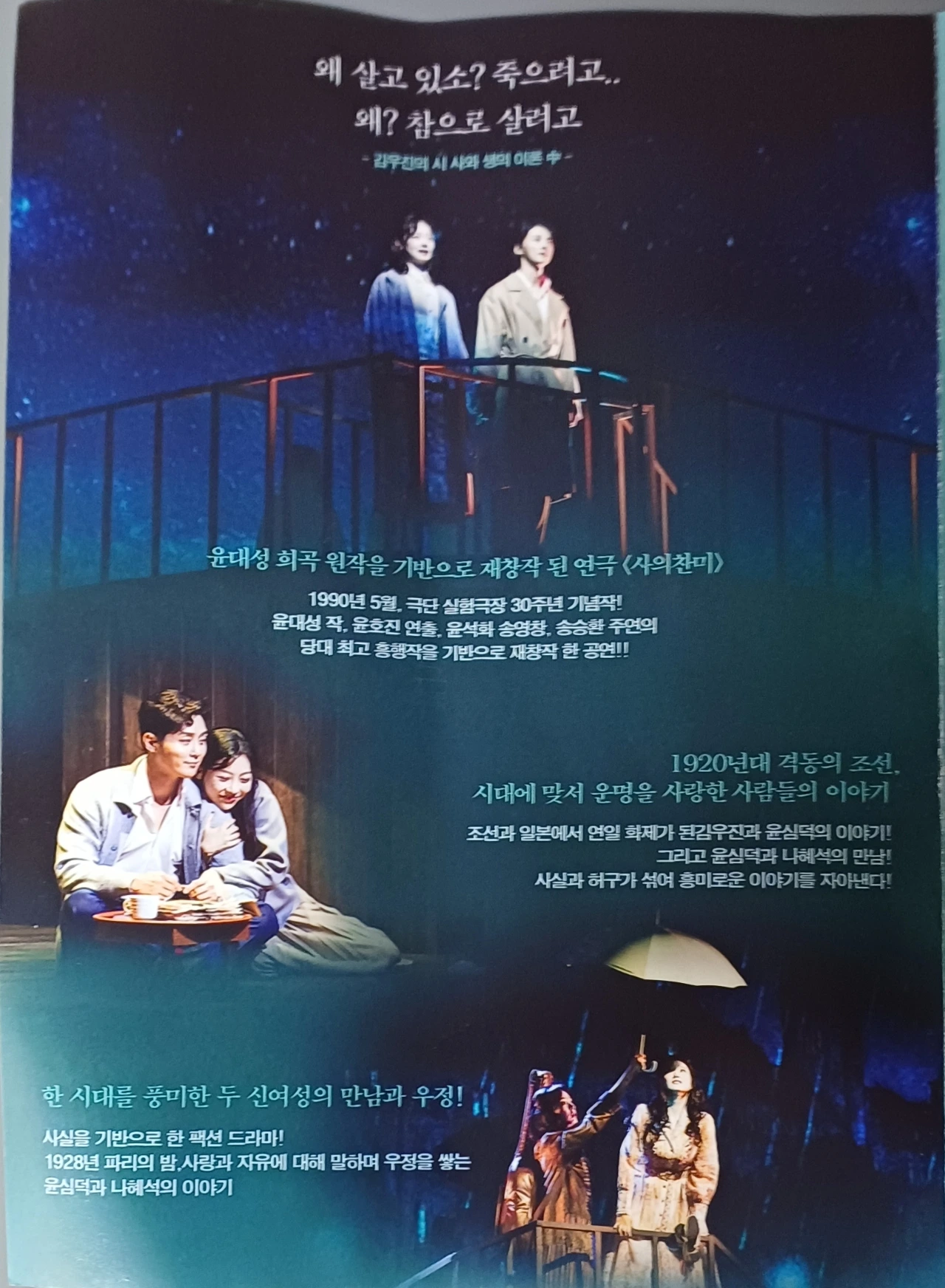 연극을 보는 내내 너무도 잘 알려진 역사적 상황들이지만 그저 목젖만 아릿하던 차에 윤심덕이 처절하게 허무한 듯 부르는 '사의 찬미'노래가 무대에서 들릴 때 울컥 눈시울이 뜨거워졌다.