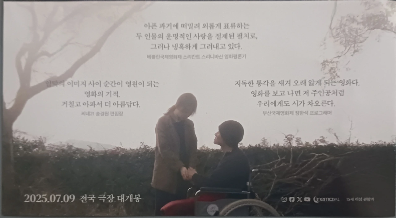 그리고 휠체어로 몸을 의지한 채 술 먹으러 요양원을 외출한 채 잠시 이별하는 기괴한 연인들의 모습도 당황스럽고 측은도 하지만 몸을 못 가누는 영경을 부축하러 휠체어에서 기어 기어서 다가간 채 업어보려고 안간힘을 쓰는 수환의 처절한 동작도 강렬했다.