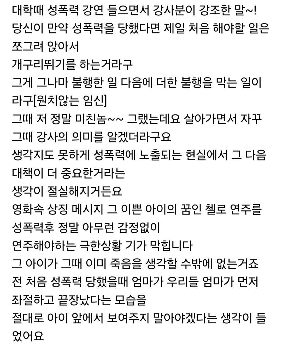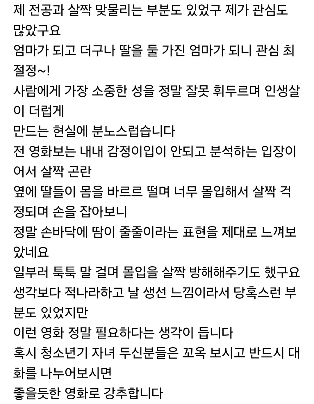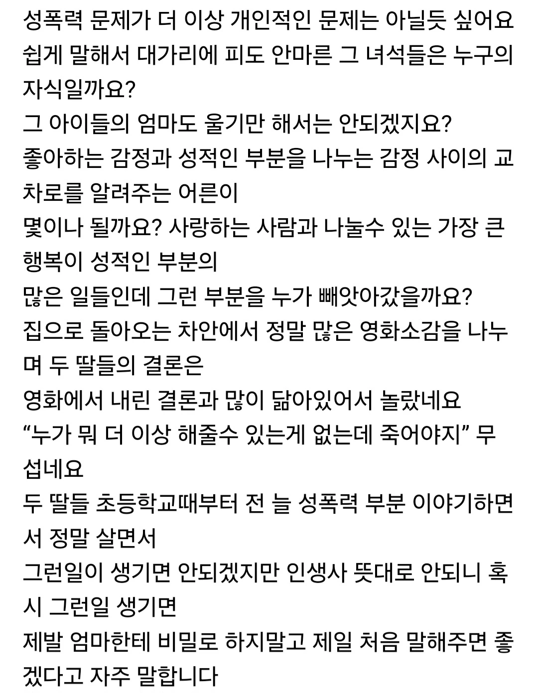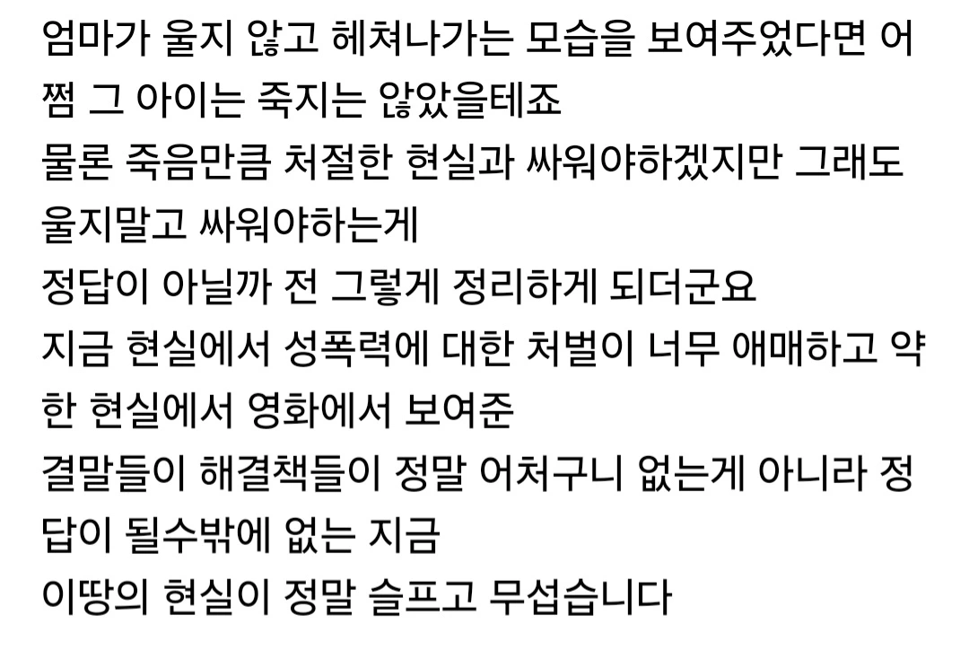 생일날 죽음을 결심한 딸의 마음이 적힌 케이크 메시지에 진짜 가슴팍살이 죄다 거칠게 분탕질되는 바람에 꺼이꺼이 울던 저희 세 모녀의 아픔은 현실적이었네요