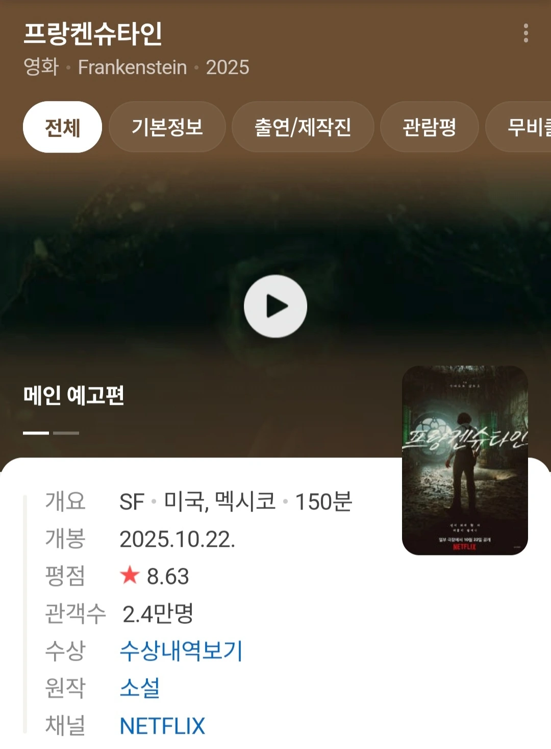 프랑켄슈타인 영화는 메리 셸리의 1818년 소설을 각색 한 작품들로, 2025년 기예르모 델 토로판과 1994년 케 네스 브래너판이 대표적인데 이번에 독서모임에서는 기예르모 델 토로판 감독의 작품으로 만났다. 기예르모 감독의 다른 작품은 아직 만나지 못했지만 주변에 감독의 영화를 만드는 시각에 찬사를 아끼지 않는 마니아들이 많았다. 조만간 다른 추천 작인 델토로의 전작 <셰이프 오브 워터>에서 그의 기조들을 만나고 싶어졌다.