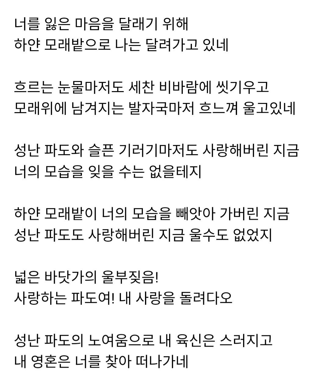 오늘 오전에 문득 떠오른 생각을 커피 타임하며 남편에게 수다 떨면서 그때 보낸 내 시가 있다며 킥킥 웃고 아무 생각 없이 제미나이에게 물었다. 내가 적은 시의 제목은 '애련'이었고 이 내용과 비슷한 전영록의 노래가 있는지 물었다. 세상에 1979년도 즈음 전영록의 노래 중에 ' 하얀 모래밭'이라는 노래가 있단다.