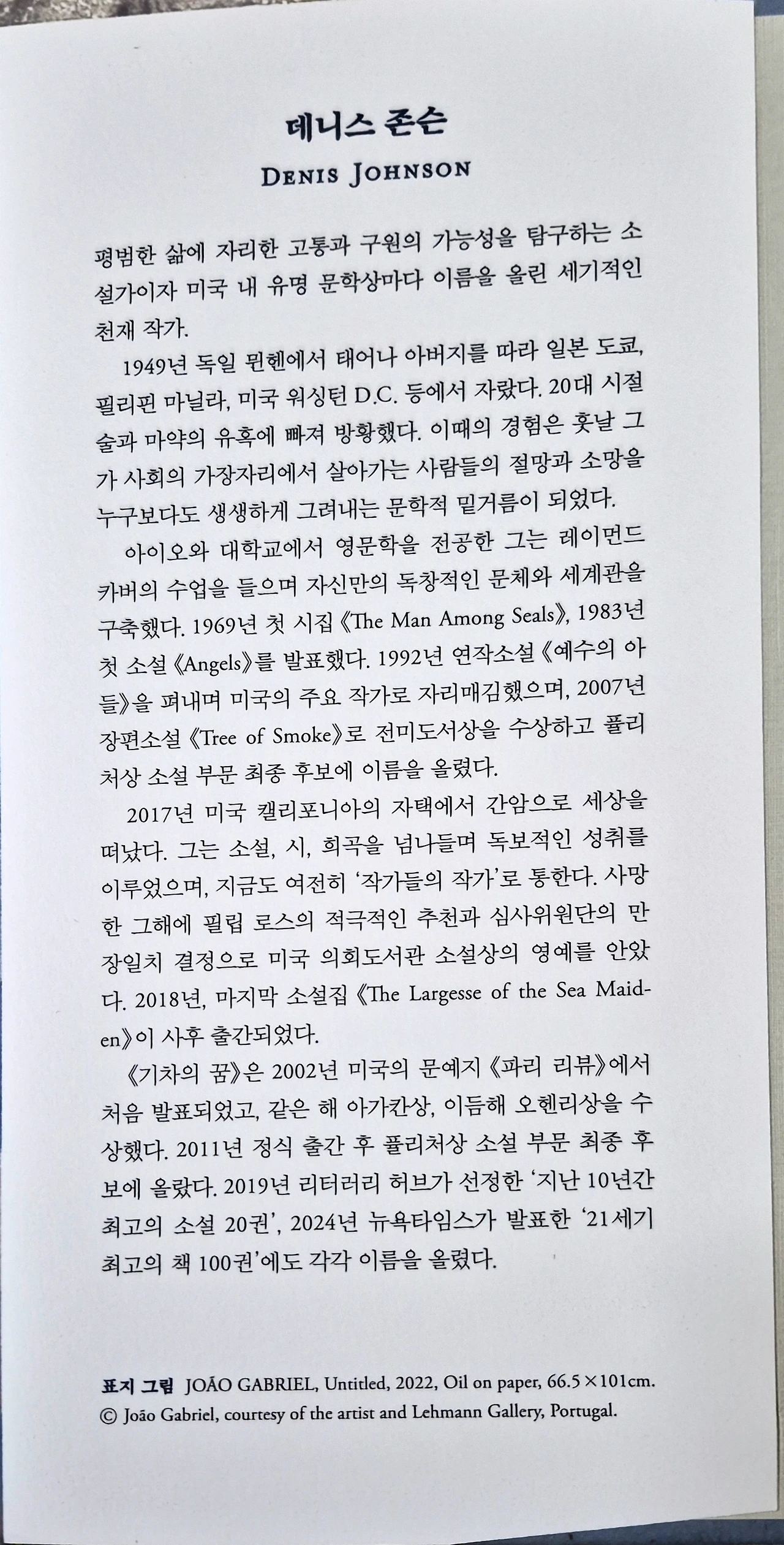 작가 데니스 존슨은 1949년 ~2017년의 생애주기로 현대 미국 문학에서 '작가들의 작가'로 불린다는 설명이 남아있다. 다양한 권위 있는 문학상도 수상하며 묵직한 작품활동을 해낸 작가로 알려졌다. 특히 '예수의 아들' 등의 단편집으로 잘 알려졌다고 해서 바로 대출예약을 해두고 이어지는 독서를 기대 중이다.