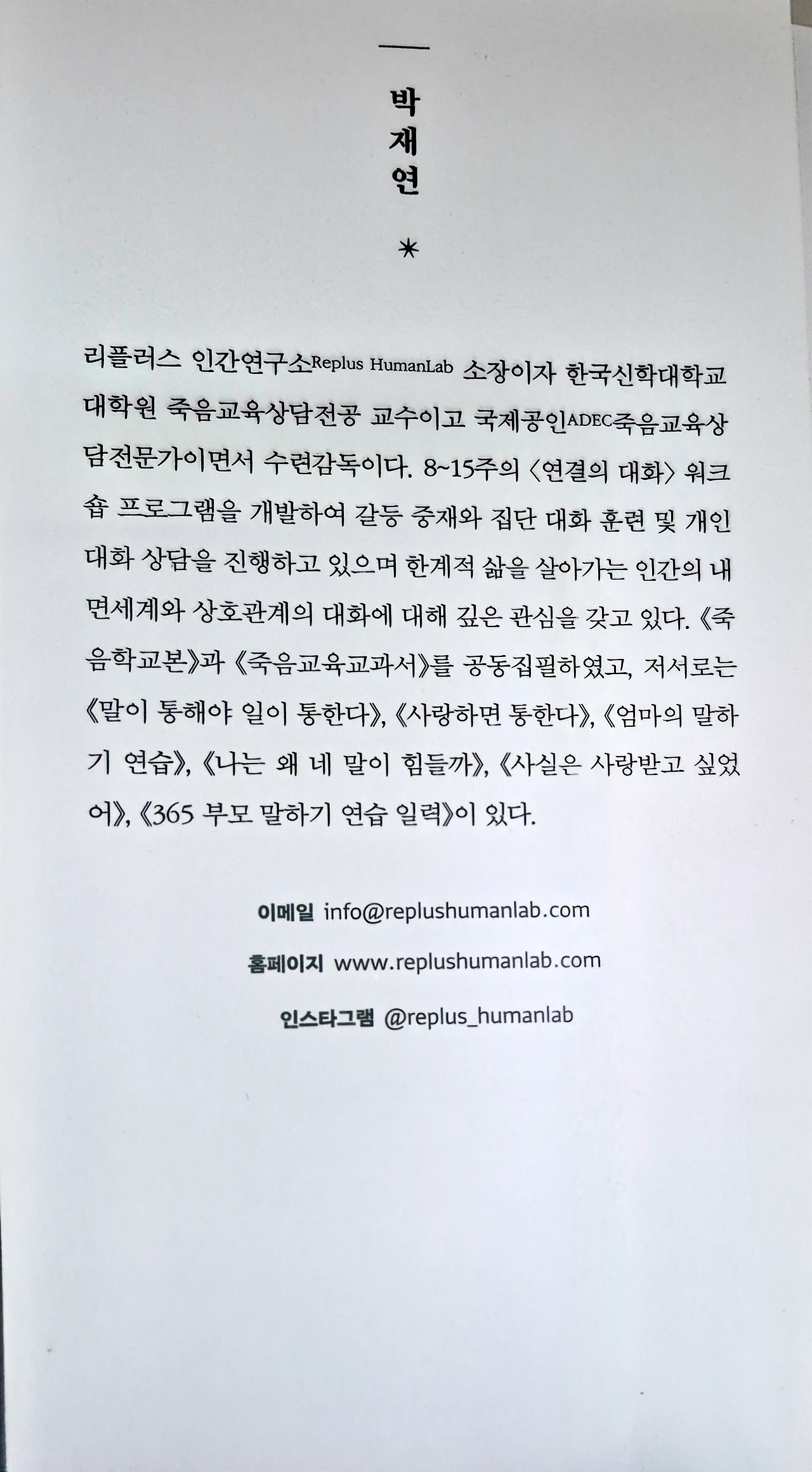 저자인 박재연은 갈등 중재 전문가로서 리플러스 인간연구소 소장을 지내고 있으면서 대화를 통한 워크숍등을 진행하는 상담 전문가로 여러 책을 펴냈다.