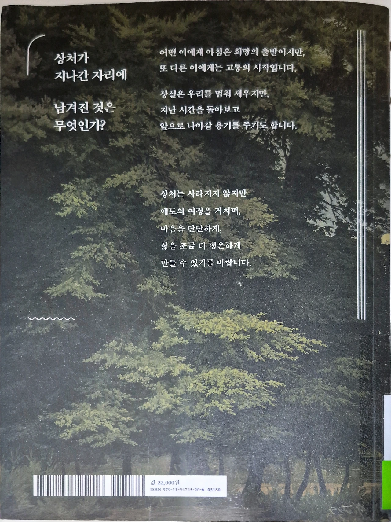 무슨 상처를 말하려는 것인지 대략은 이해가 되었지만 무언가 가려운 곳을 긁어주지 않는 아쉬운 마음을 남긴 독서였다. 난이도가 애매한 경계에서 두리번거린 느낌으로 독서를 마쳤으니 내일 독서모임에서 토론을 하며 어설픈 나의 시각을 좀 더 살피고 맑은 해석을 얻었으면 좋겠다.