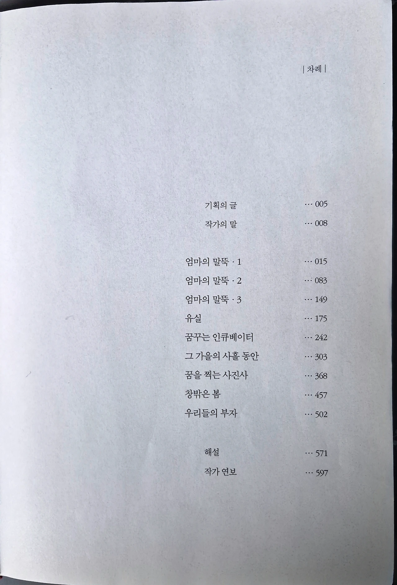 유실 (175쪽 ) , 꿈꾸는 인큐베이터 (242쪽) , 그 가을의 사흘 동안 (303쪽 ) , 꿈을 찍는 사진사 (368쪽) , 창밖은 봄 (457쪽) , 우리들의 부자 (502쪽)라는 단편들은 각각의 색채로 독자를 사로잡는 구성이 엿보인다.