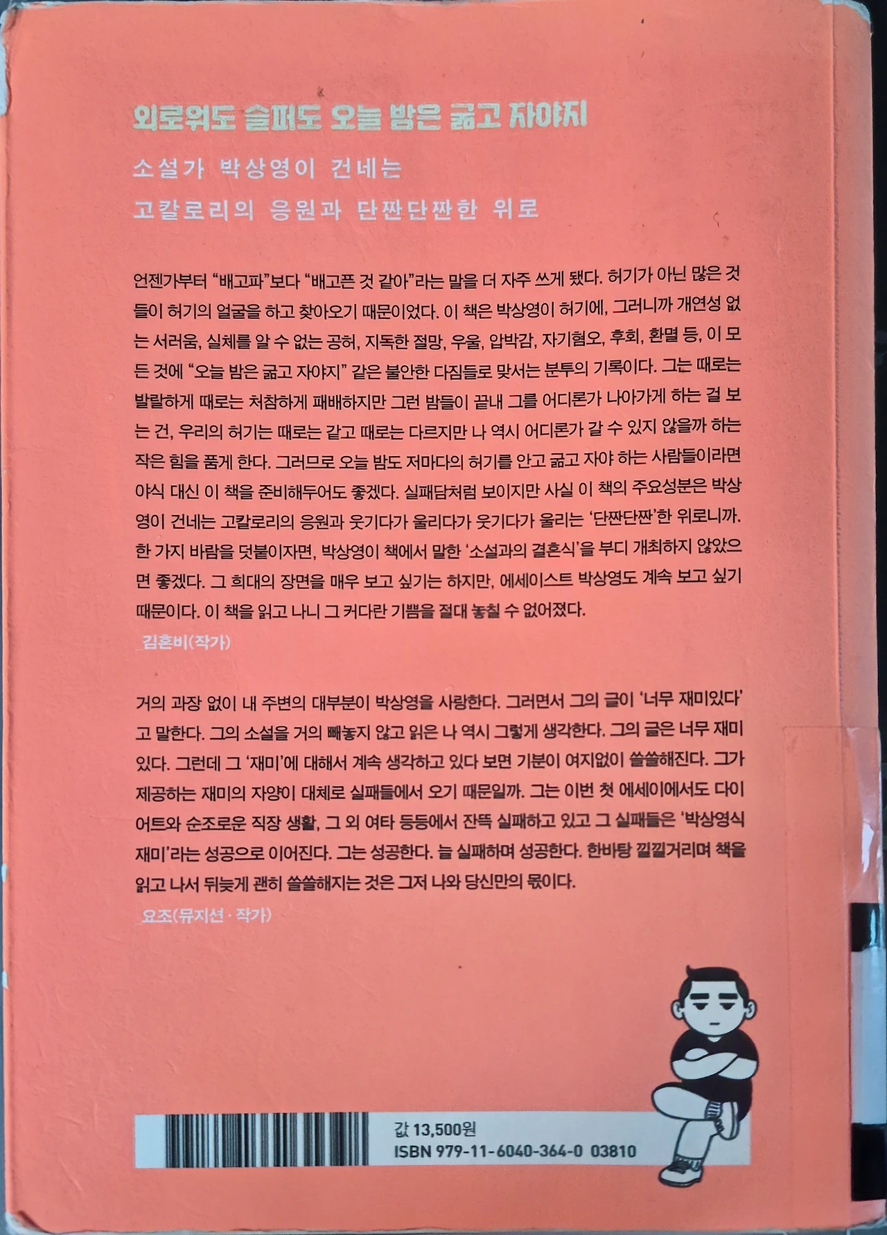 그래서인지 ' 오늘 밤은 굶고 자야지 ' 책 속의 박상영 작가의 일상이 더 선명해졌다. 왜냐하면 그저 일상의 지루한 반복과 허무한 작태들 속에서 박상영 작가가 응시한 그곳에는 진지한 삶의 성찰과 목표의식을 베이스로 늘 깔아 둔 사투로 점철된 치열함이 느껴졌기 때문이다. 치열한 생존을 위한 매일의 발걸음 속 테마가 바로 야식이고 섭취이고 만족이 아니었을까 깊게 공감되었다. 결과적으로 그런 나날들의 터널을 뚫고 빠져나가서 만난 빛이 충분히 가치 있는 결과여서 지금의 박상영이라는 위치가 확보된 것이 아닐까?