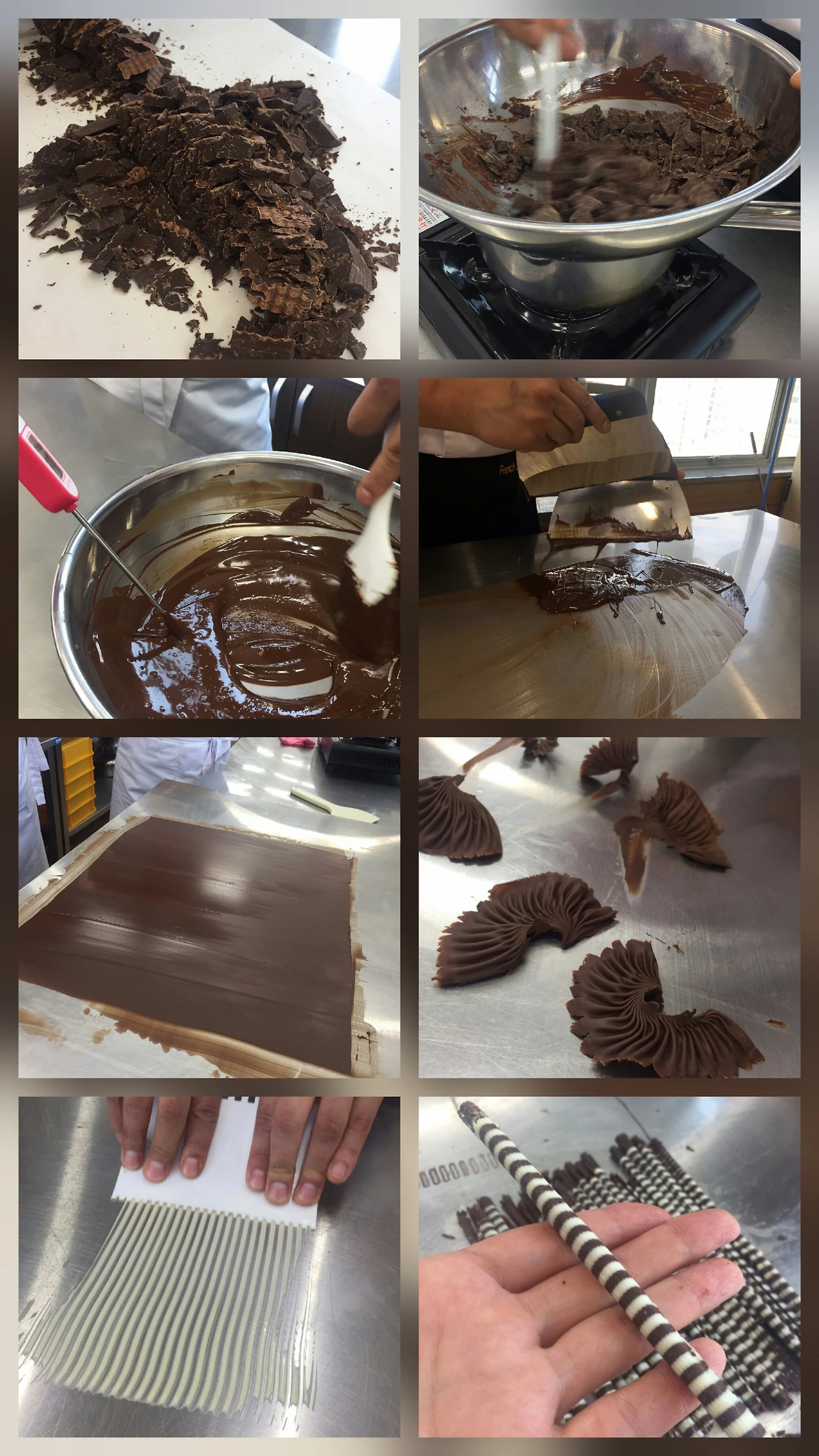초콜릿 마스터 실기 시험은 가장 기본적인 스킬을 체크하는 범주라서 완성하려는 고체 초콜릿의 계량과 템퍼링이라는 온도 조절하며 액체화 시키는 기본과정을 통과하는 게 시험이었다. 1차 템퍼링에서 실패하면 다음 작업은 못하기에 그 기본이 가장 중요하다. 그리고 철판 보드에 액체 초콜릿을 붓고 굳으면 기본적인 리본 모양과 막대 모양의 제품을 완성해서 자기 수험표가 있는 트레이에 올려두고 퇴장하면 심사위원들이 체크해서 합격여부를 통보해 주는 시험이었다. 요즘 핫한 요리 오디션 프로그램과 유사한 시스템이라고 보면 될 것이다.
