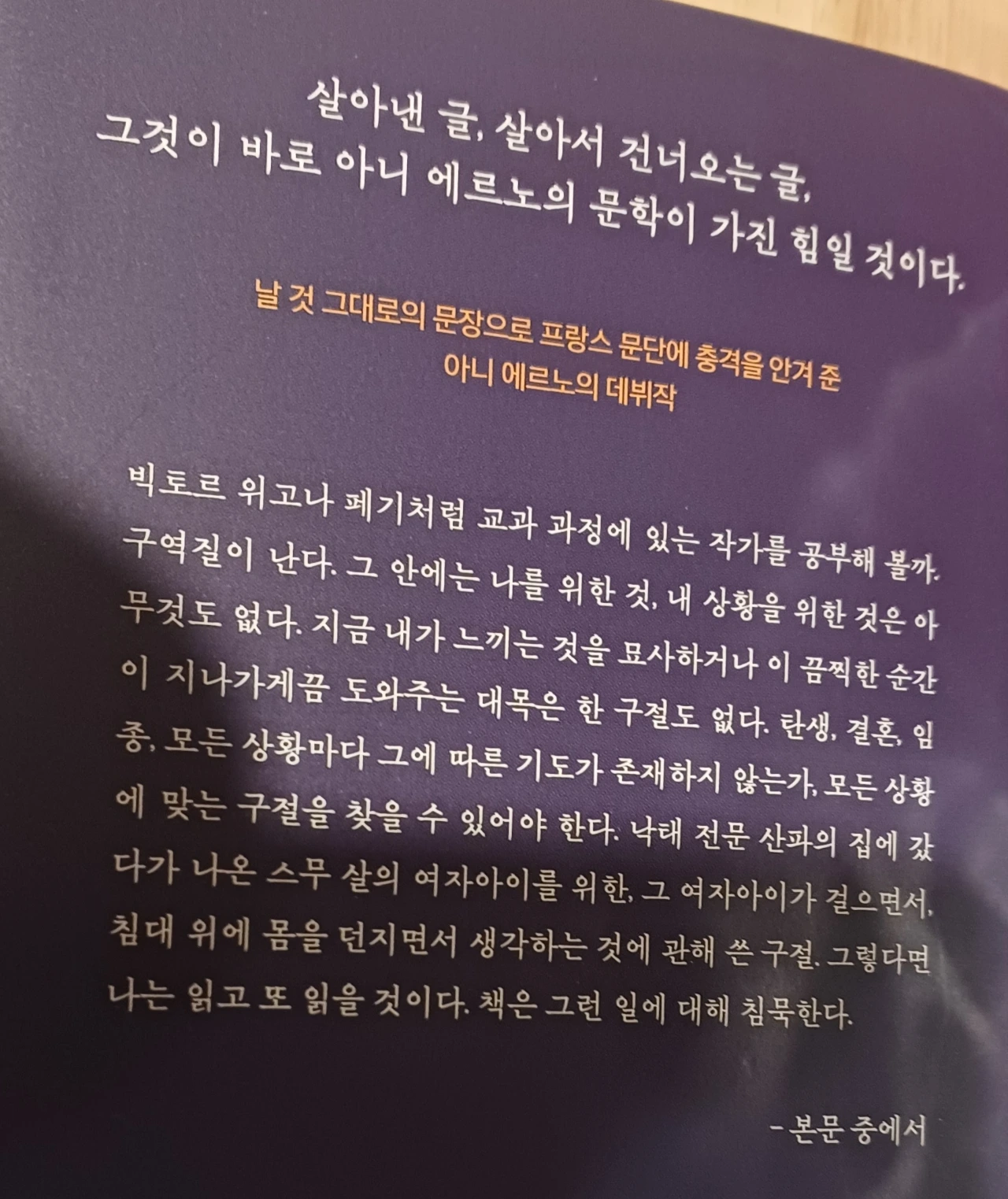 능동적인 채움을 시작하고픈 바람을 위해서 작가 아니 에르노는 첫 작품부터 크게 한방 날리우고 문학 속으로 뚜벅뚜벅 발걸음을 옮긴 것 같았다.