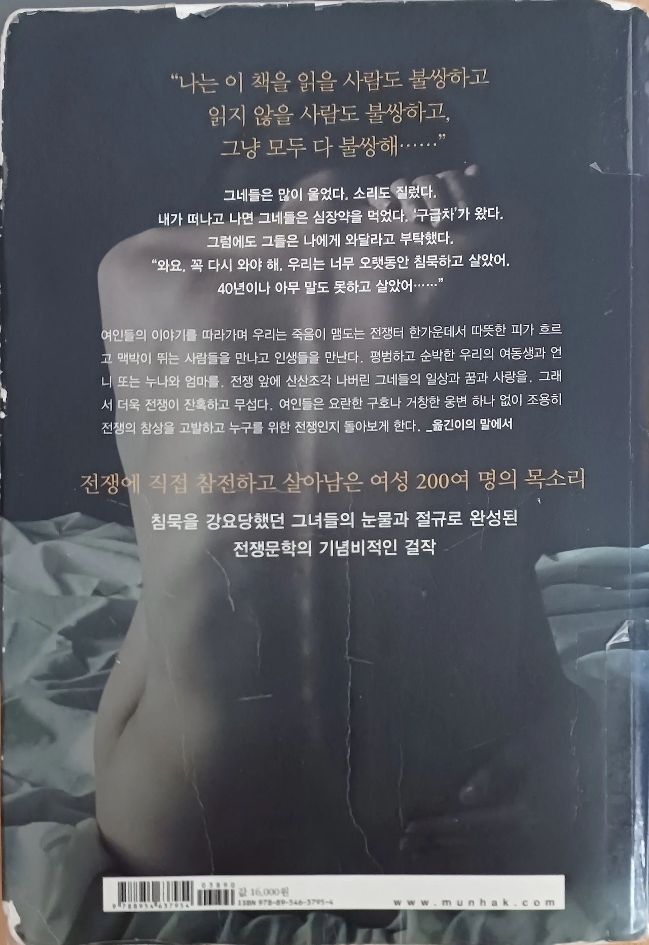 전쟁은 처참하고 많은 이는 죽었고 간신히 살아남은 사람들도 너덜거리는 아픔을 싸매고 있어야 하는 진실의 목소리를 만난 독서였다.