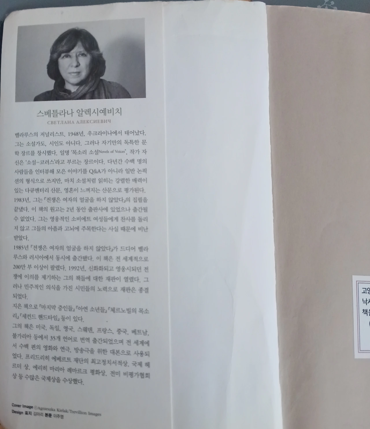 2015년 노벨 문학상을 수상한 저자는 카테고리가 명확한 다섯 권의 책들 속에서 전쟁과 인간의 존엄성에 대한 목소리를 낸 역량 있는 여성작가였다.