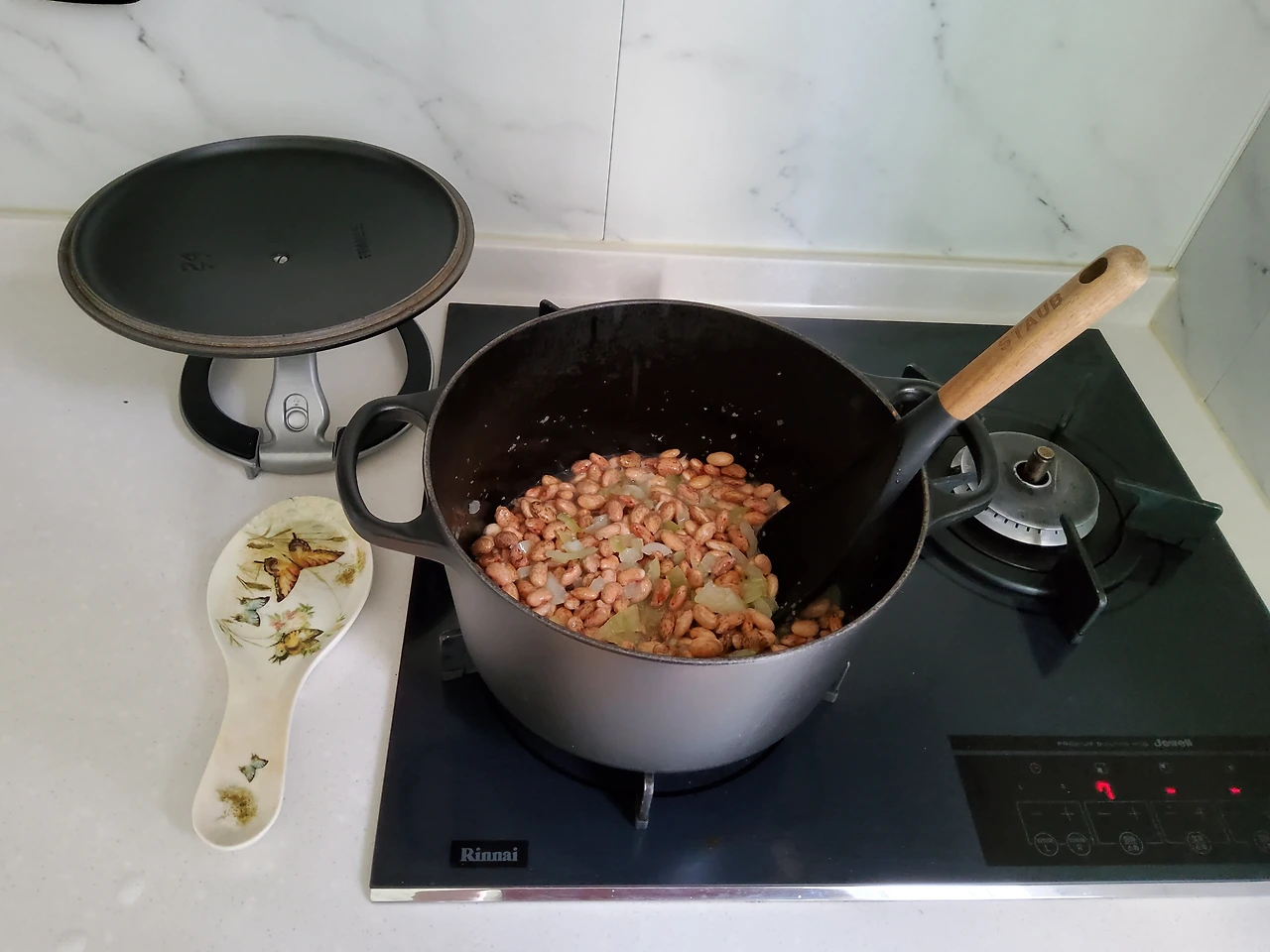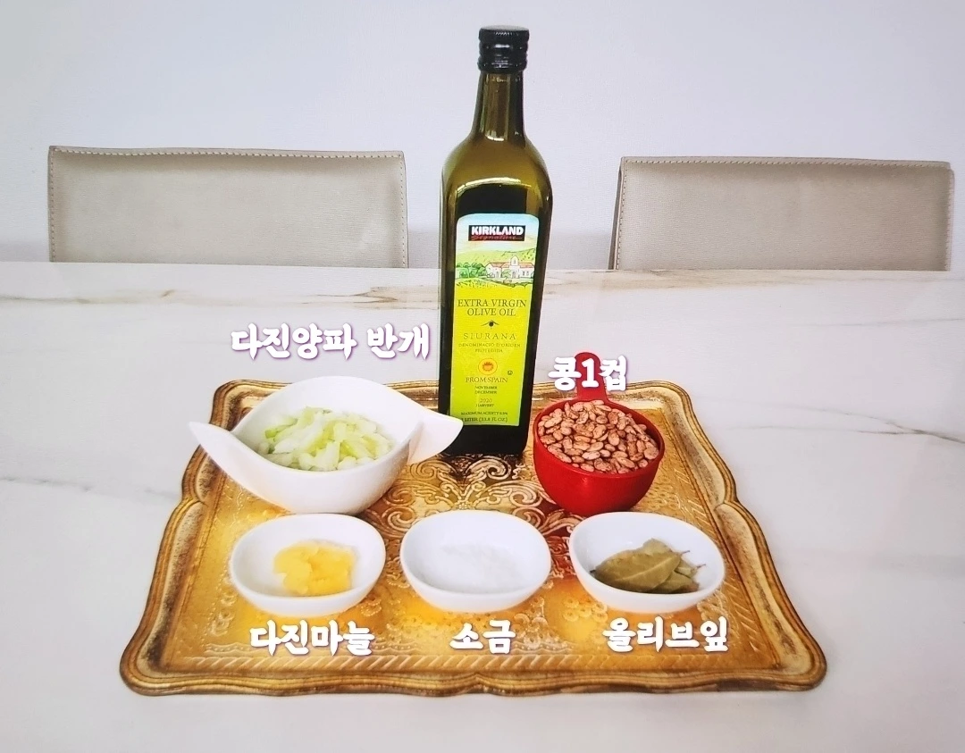 *다진 양파 반 개, 다진 마늘 1스푼, 기름 1스푼을 넣고 볶다가 불린 콩을 넣고 조금 더 볶은 후, 물을 3컵 을 붓고 끓인다 *