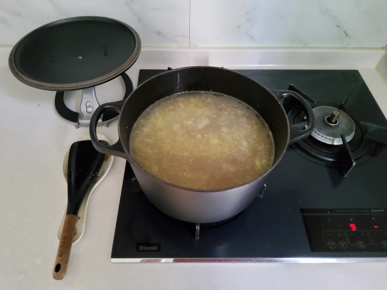 * 물을 3컵 넣은 후, 끓으면 약불에 40분 정도 끓인다, 취향에 따라 소금으로 간을 맞추고 국물량도 조절한다.*