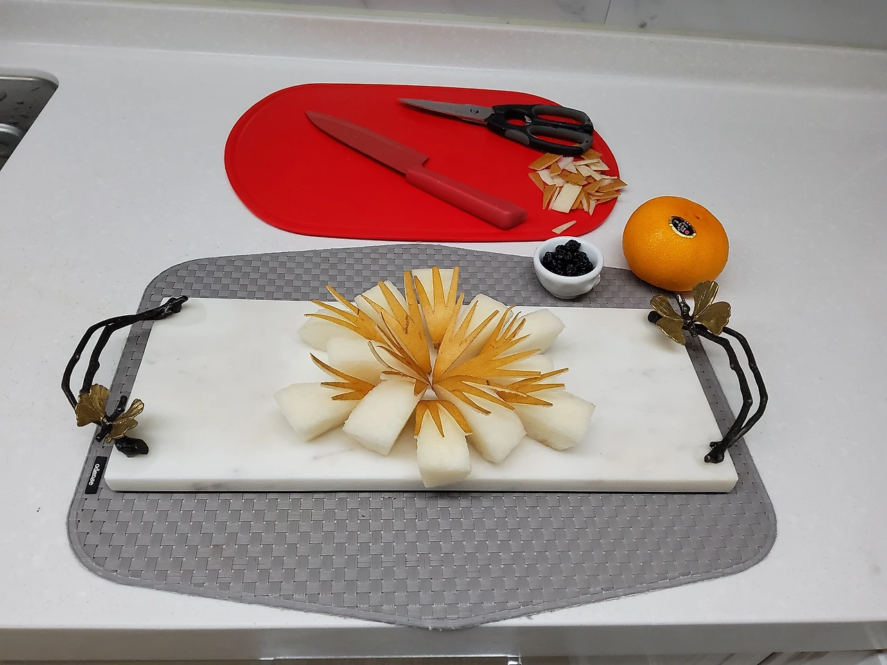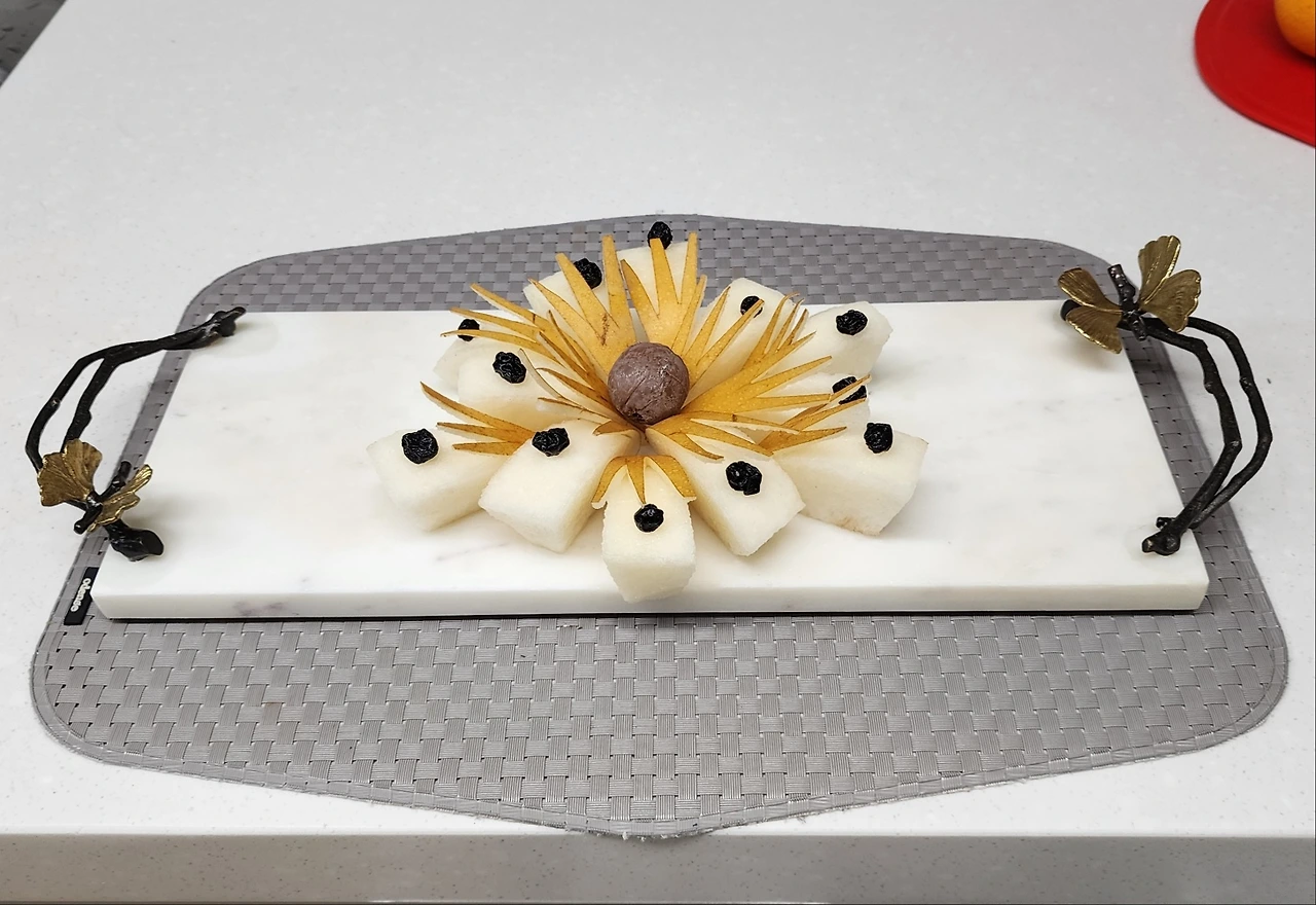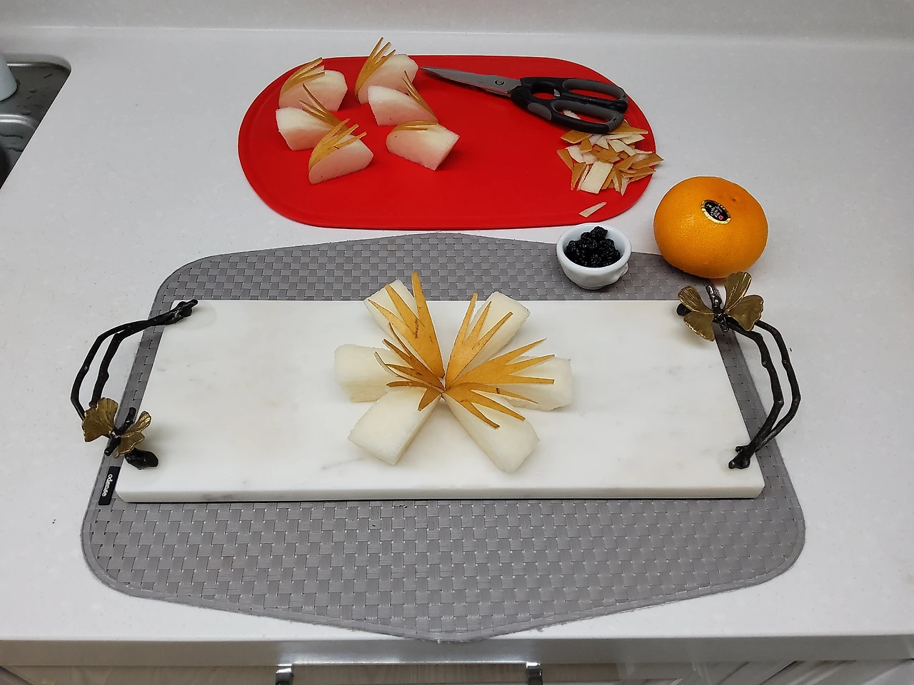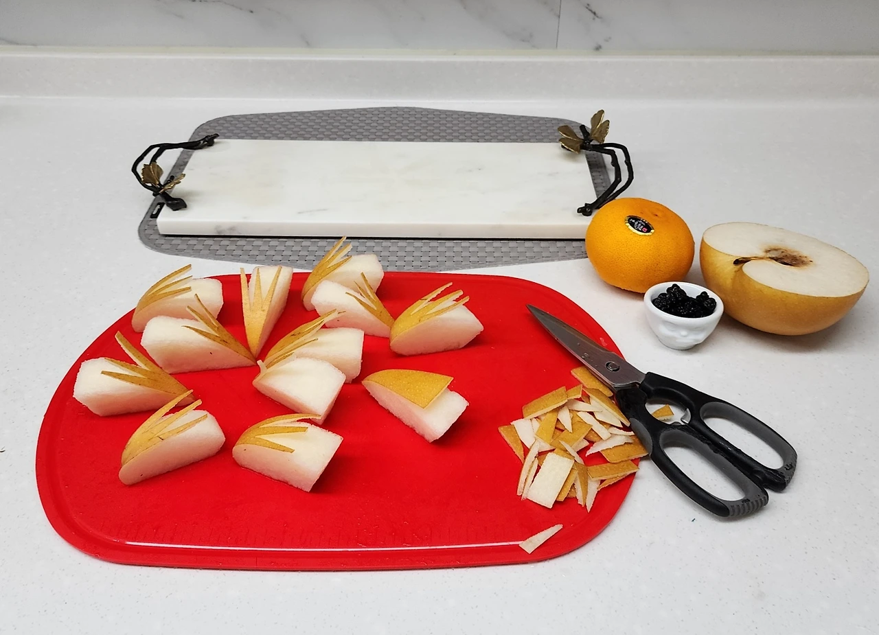 노랗게 익은 탐스러운 배를 가르고 조각내어 가위로 꽃잎을 만들면 접시에 예쁜 꽃이 피어나고,