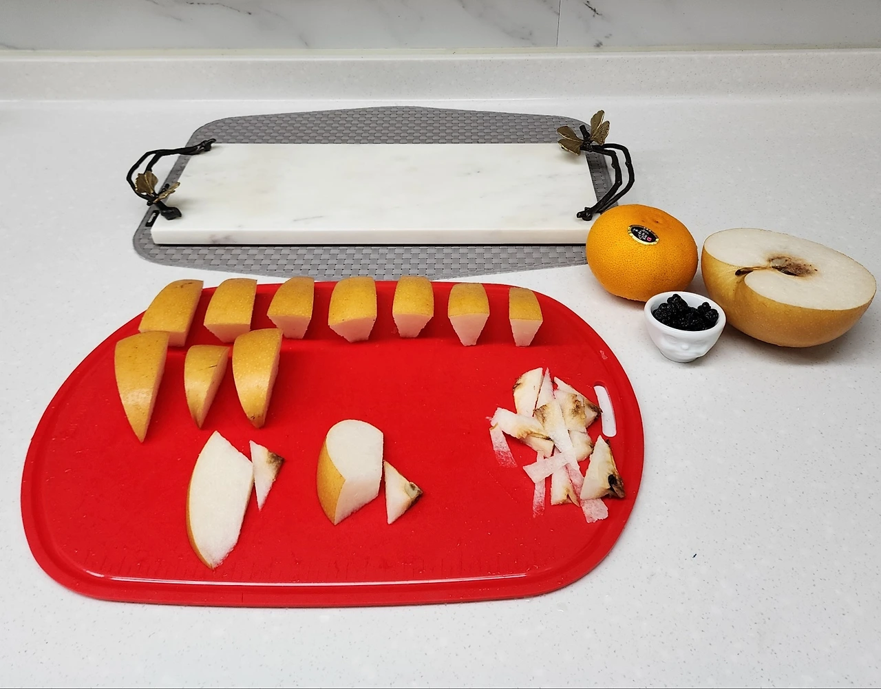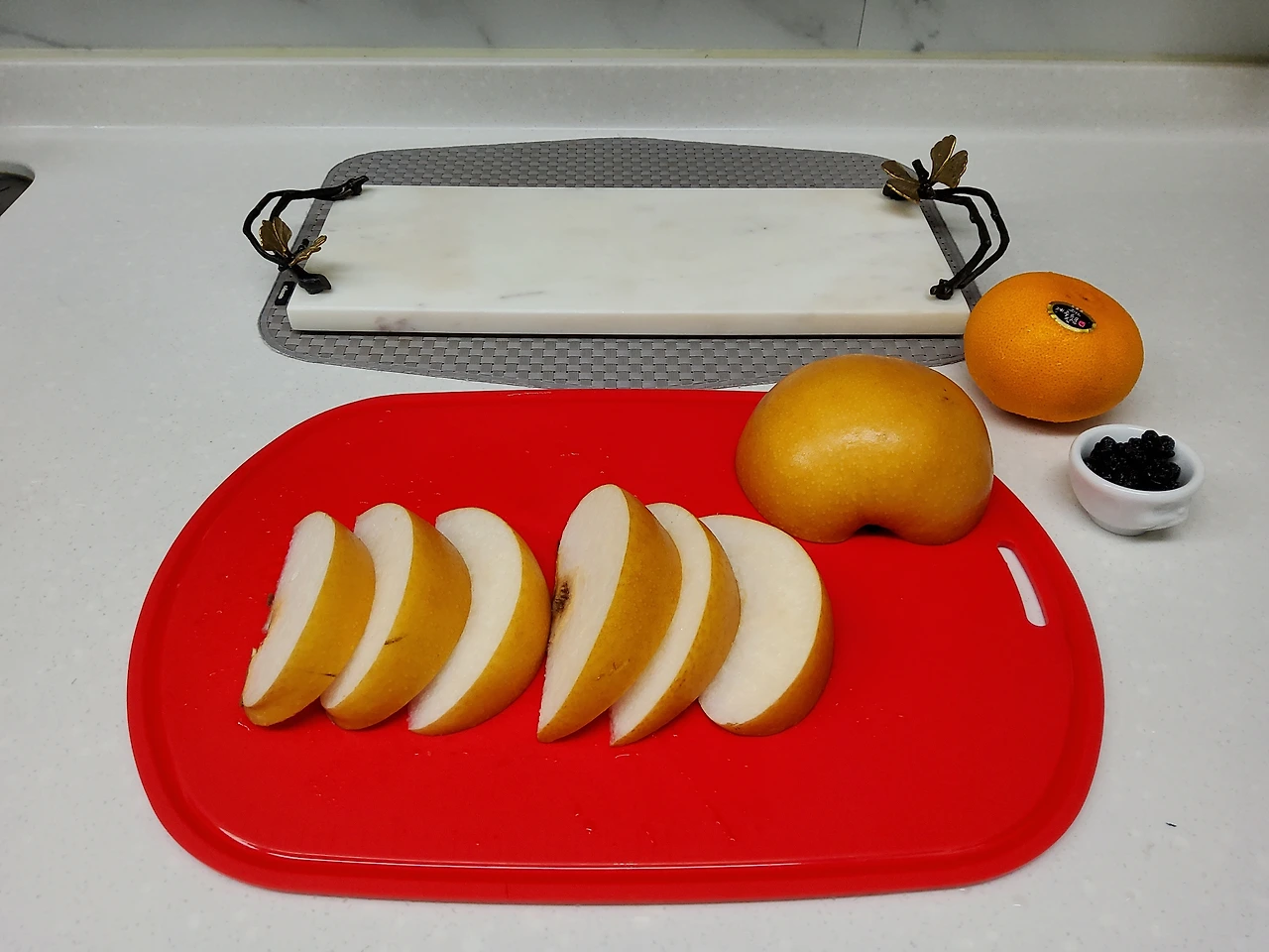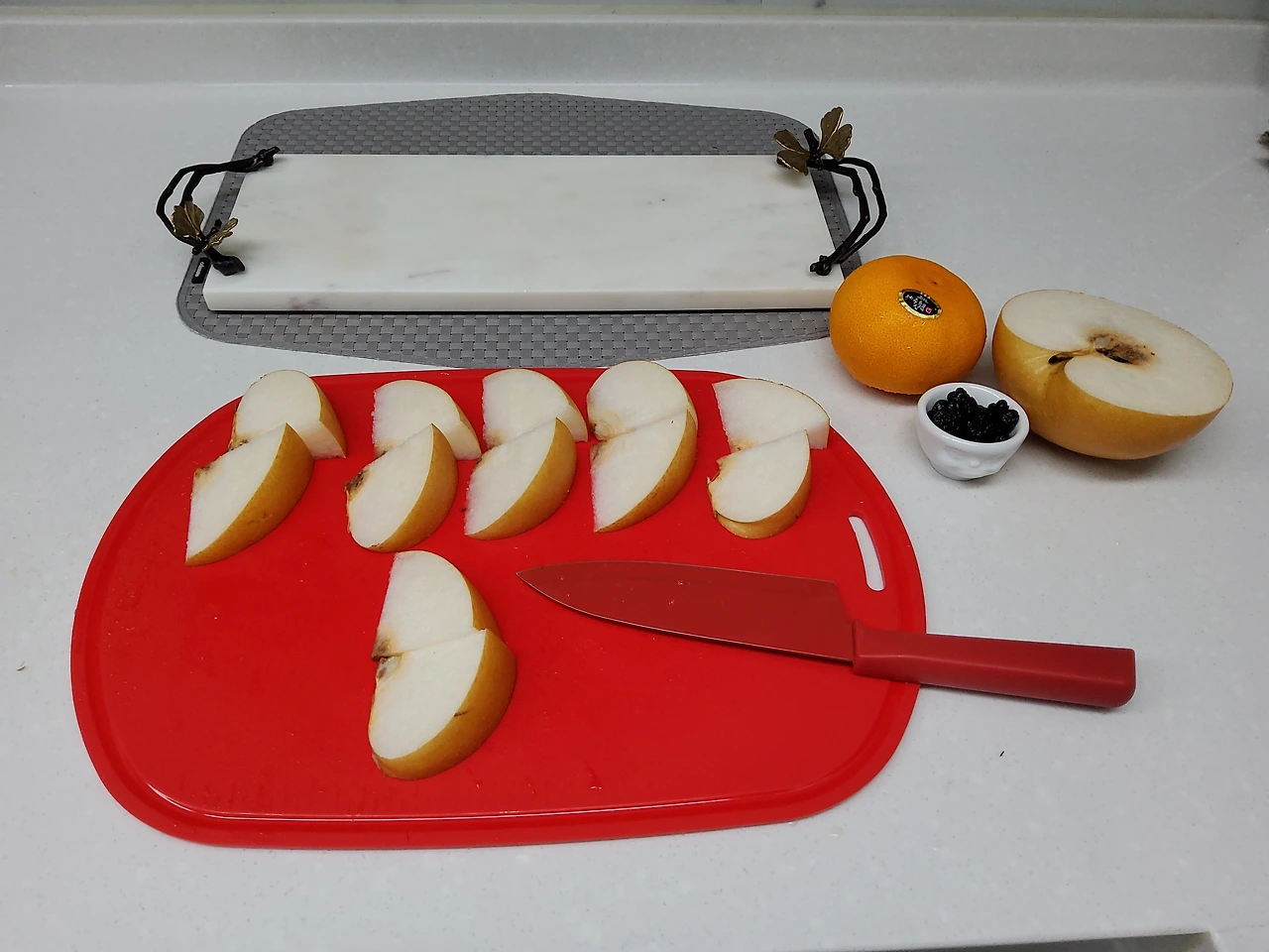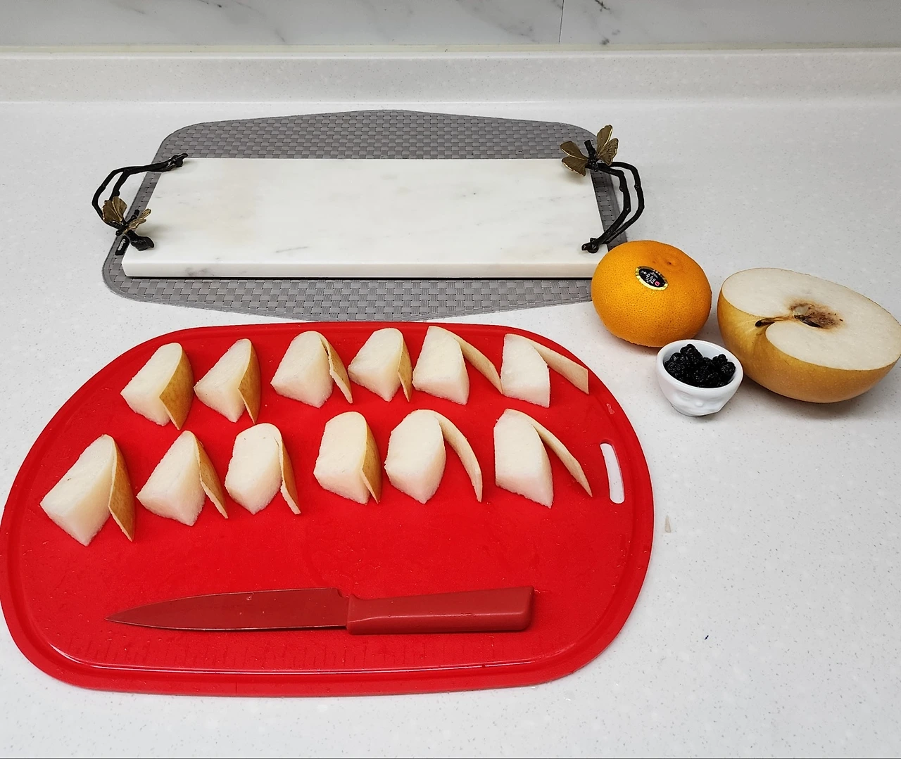 노랗게 익은 탐스러운 배를 가르고 조각내어 가위로 꽃잎을 만들면 접시에 예쁜 꽃이 피어나고,