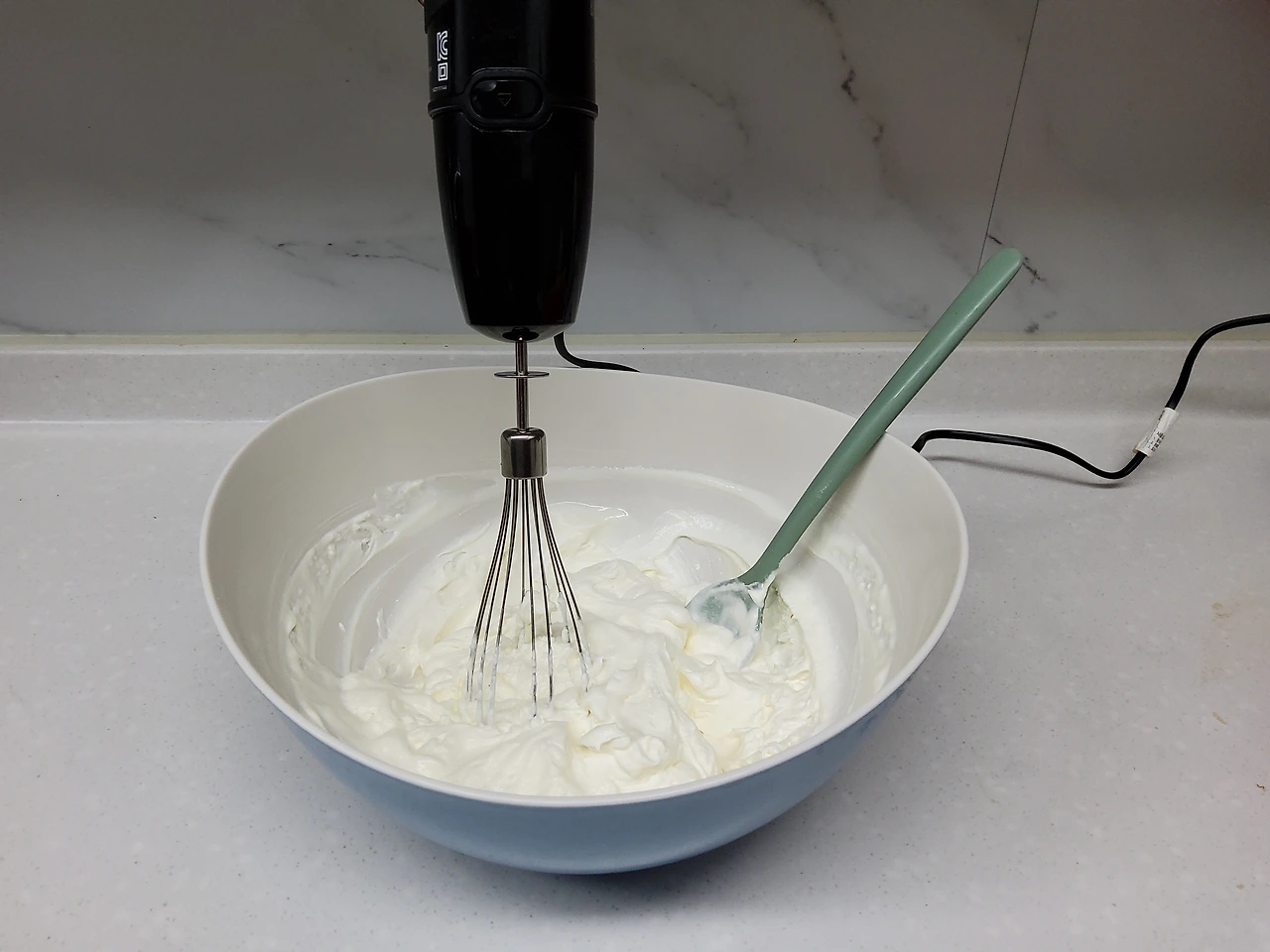 휘핑하면서 상태를 잘 살펴, 믹서를 들어 올렸을 때 끝이 살짝 구부러지면서 뿔 같은 모양이 유지되면 휘핑 끝.