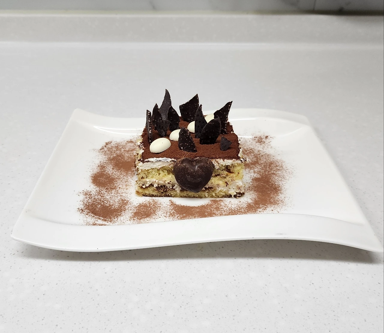 정성껏 만든 티라미수 한 조각... 화이트, 다크 초콜릿으로 포인트를 더 했다.