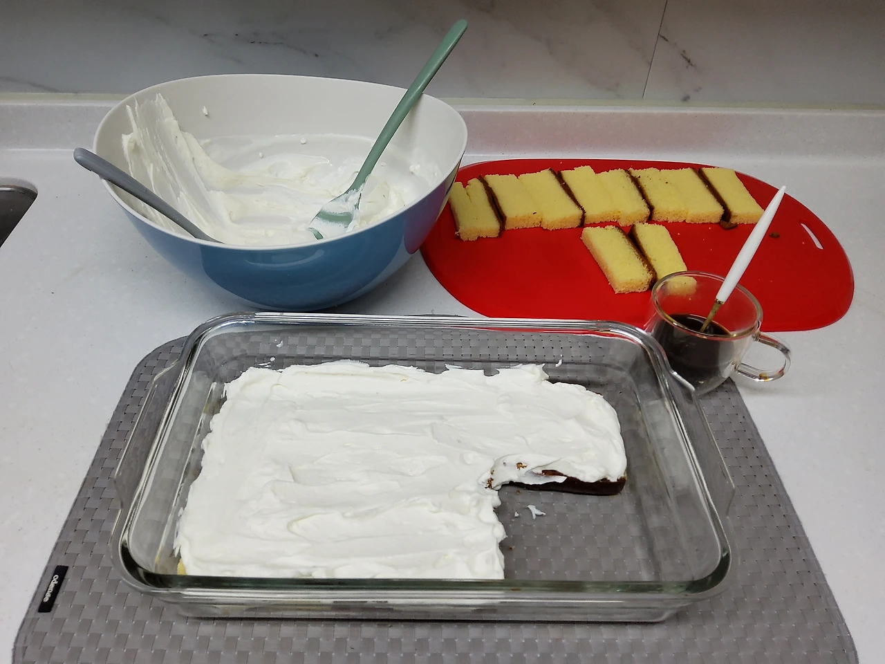 나는 디저트로 먹기 위해 카스텔라에 에스프레소 커피를 뿌리고 휘핑한 크림을 올려 정성 들여 티라미수도 만들었다.